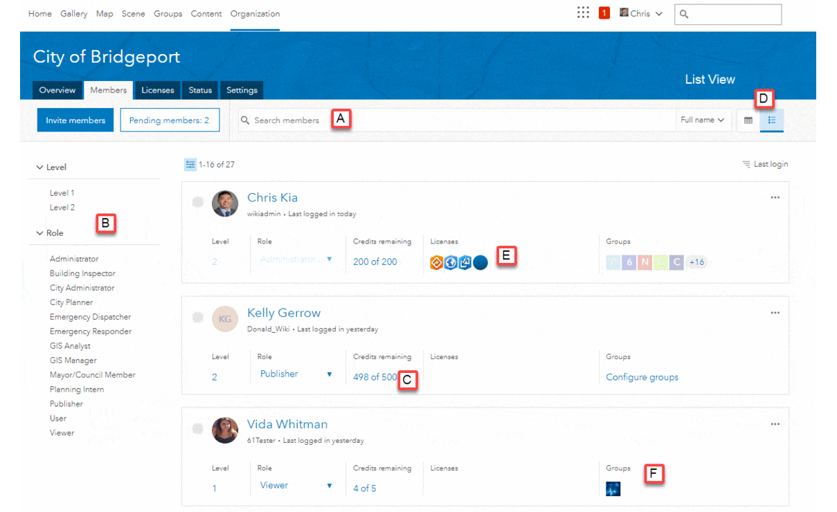 The updated members page shows new ways to search and organize users. Organization administrators can now search by name (first, last, or both) and username (A), and filter based on the user level and role (B). The “Credits remaining” column now includes both the initial amount of credits allocated to the user and those remaining (C). This provides a better reference for the number of credits used by a member. The new design includes both table and list views to browse members (D). The table view is similar to the current design, while the list view provides some additional information about members, such as licenses assigned (E) and groups they have joined (F). Some attributes in list view link to an action for the member. For example, clicking on groups will take administrators to member’s group page where they can manage the group membership for the member (Fig. 1).