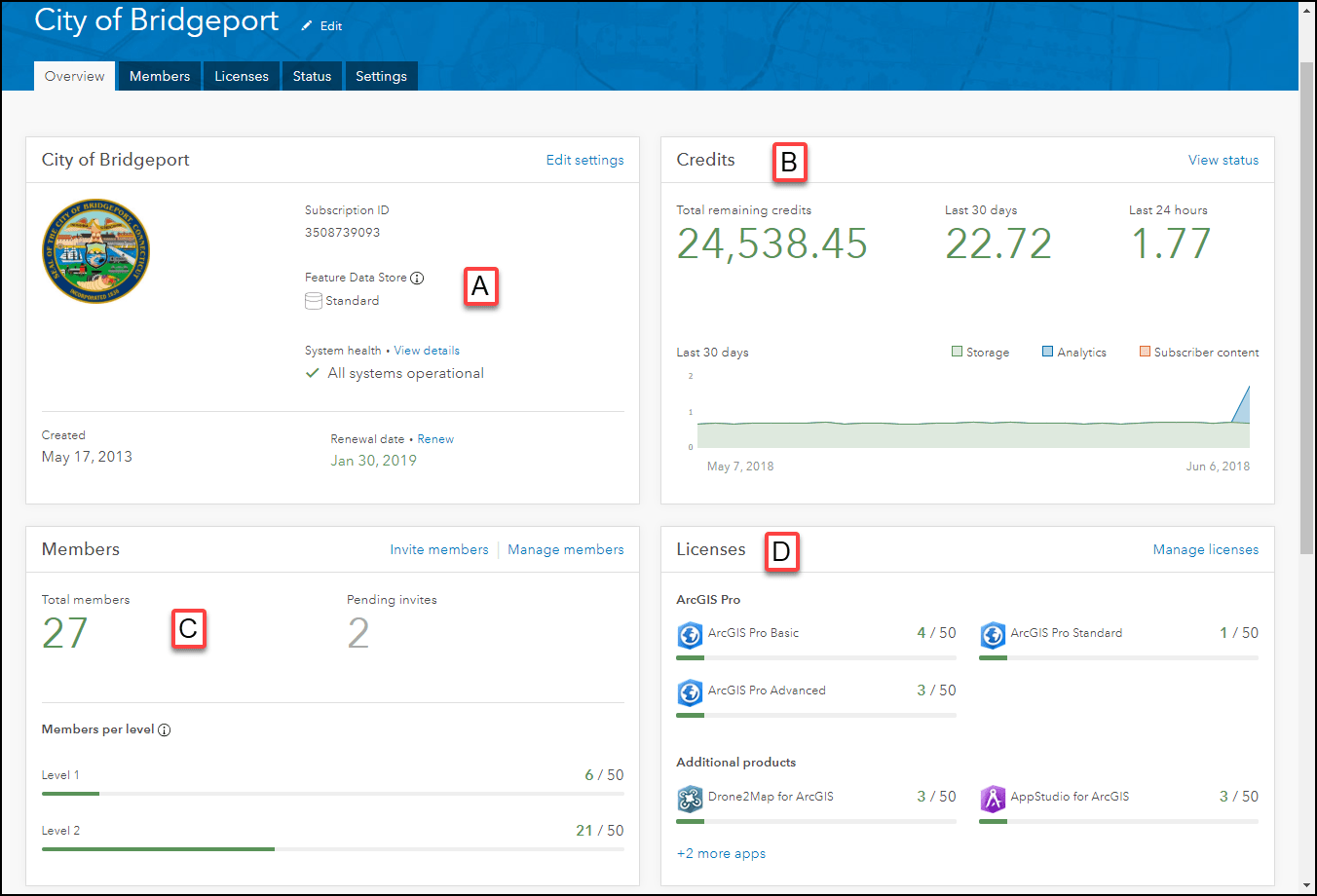 The first thing you’ll notice are the updated tabbed interface and the new overview page. When viewing the new overview page, highlighted information about key features are displayed to administrators as cards. The overall system health of ArcGIS Online (A), a quick overview of credits (B), members (C), and licenses (D) will be visible to administrators with the initial load of the organization page. To find out more details about the topics displayed on the cards, admins can quickly navigate to the full page by either clicking the blue text in the right-hand corner of the card or the corresponding tab.
