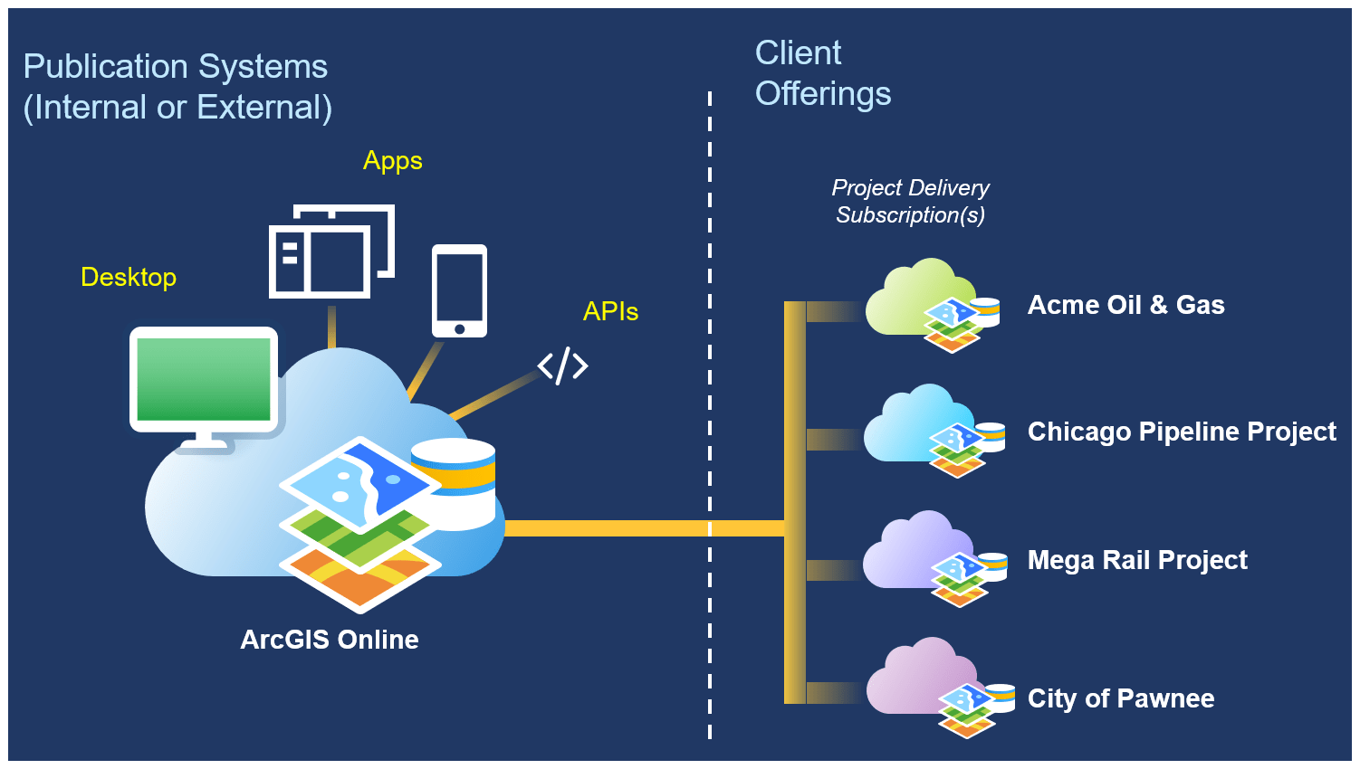 Collaboration has always been a core component of ArcGIS Online and Enterprise. This great video illustrates the various types of collaboration and content sharing capabilities possible within ArcGIS Online. An AEC Project Delivery subscription is a stand-alone ArcGIS Online or Enterprise (cloud only) instance that is meant specifically for a project or external engagement with a customer.