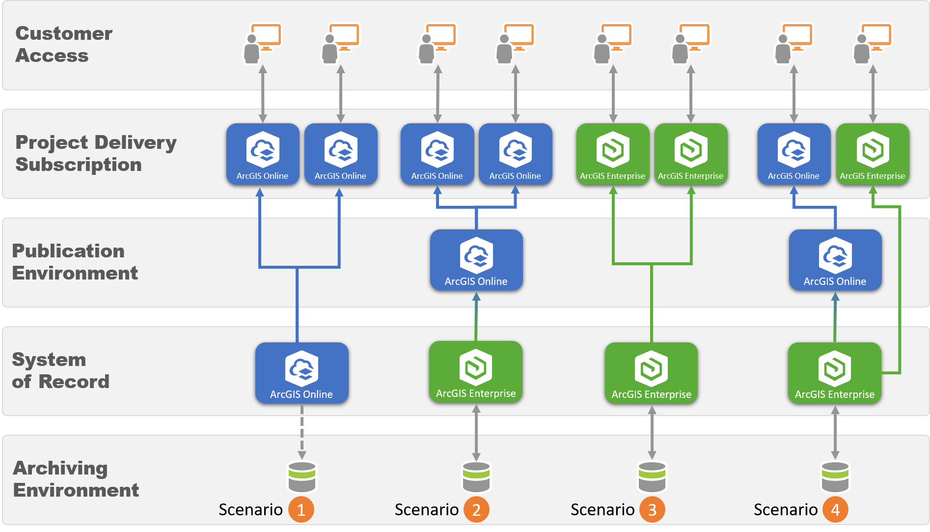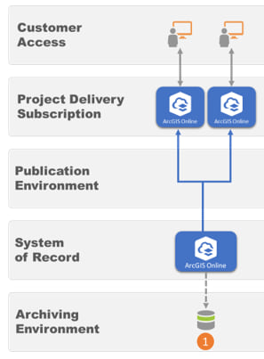 - Scenario 1: This scenario is one of the most common patterns for deployment, and in many cases, it is a component of other deployment scenarios. This option connects your existing ArcGIS Online Organization subscription to one or many AEC Project Delivery subscriptions. Group Sharing is how you make this connection. The benefit of this approach is its simplicity. The drawback of this approach is that ArcGIS Online does not take advantage of a direct read-write to an Archiving or Enterprise Geodatabase environment.