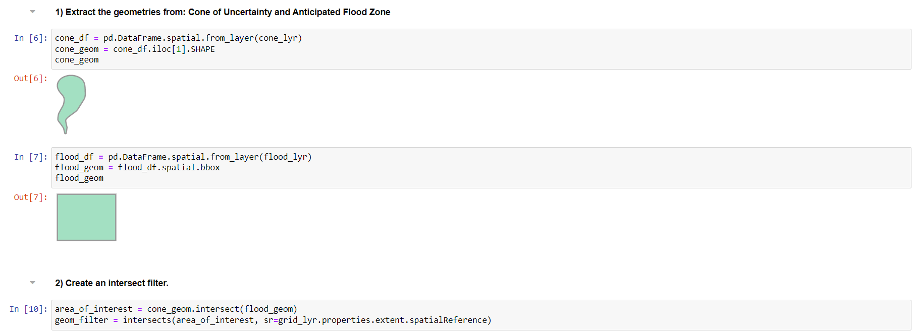 1. First, she extracts the geometry for the latest cone of uncertainty and anticipated flood zone. By intersecting the geometries, she can create an area of interest to be applied to a layer of grids that act as bounding polygons.