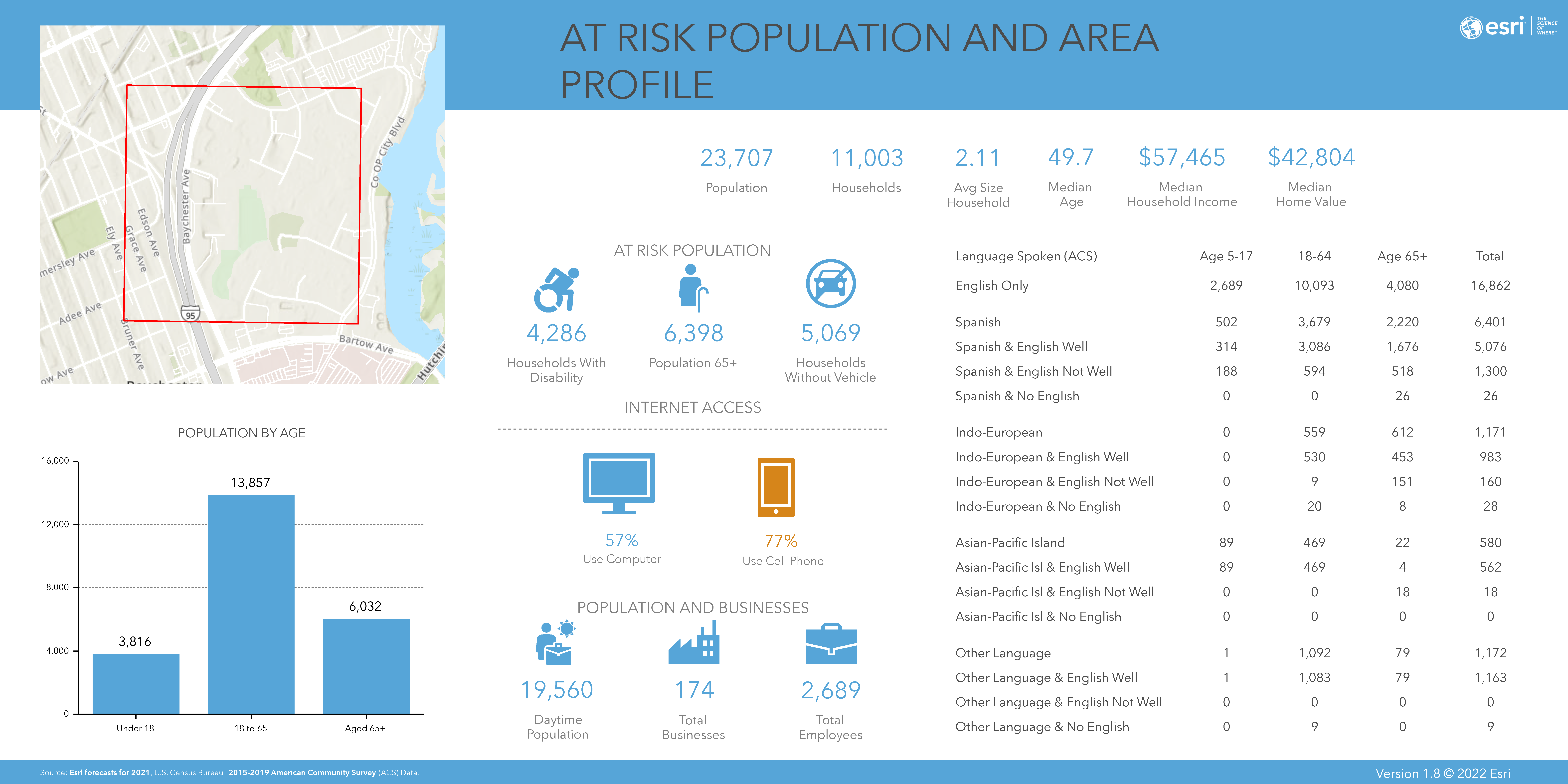 The report includes a map of the impacted vicinity along with quantitative results to describe pertinent demographic details.