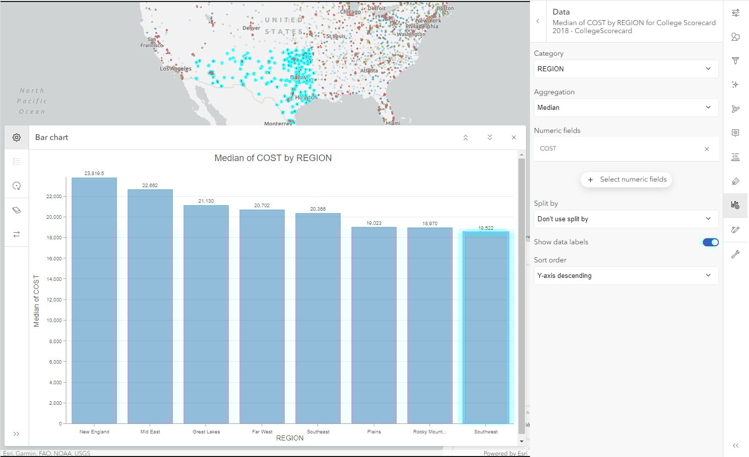 Looking at the median of cost by region, we see that the chart doesn’t show significant variation and expected cost of education in different regions of the county are comparable. We can select the Southwest region to see the lowest median cost region. This selection will highlight those institutions on the map.