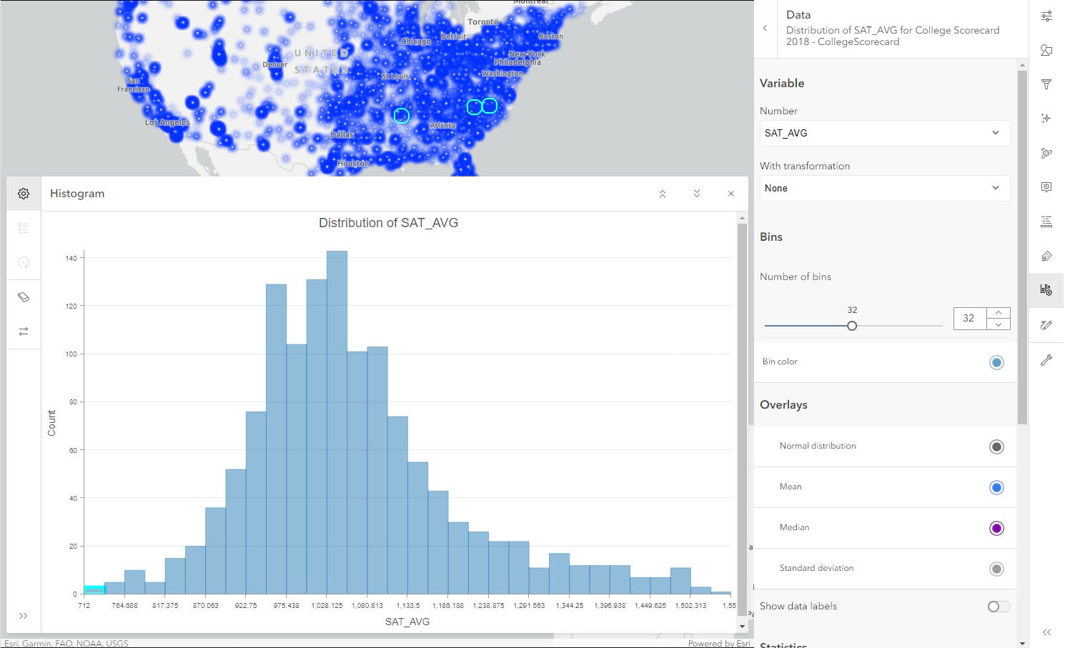 The first thing we will do is create a histogram and see how the SAT score average is distributed (SAT_AVG). We will scroll down to see the statistics table, where we can see the mean, median, maximum, minimum, null value etc., for this variable.