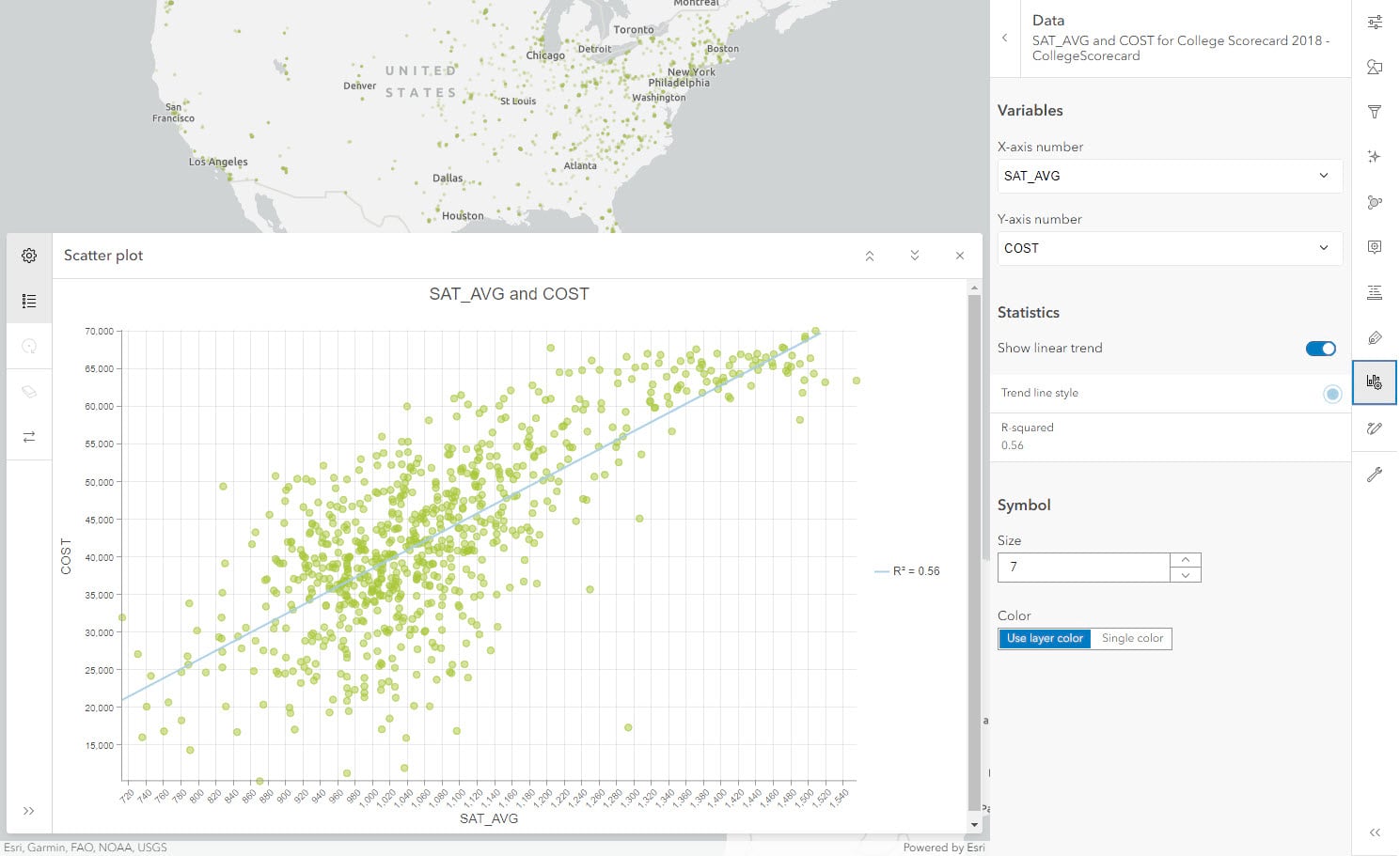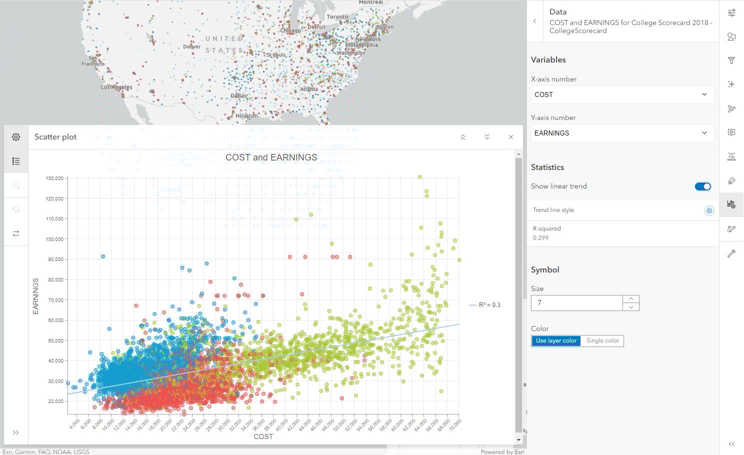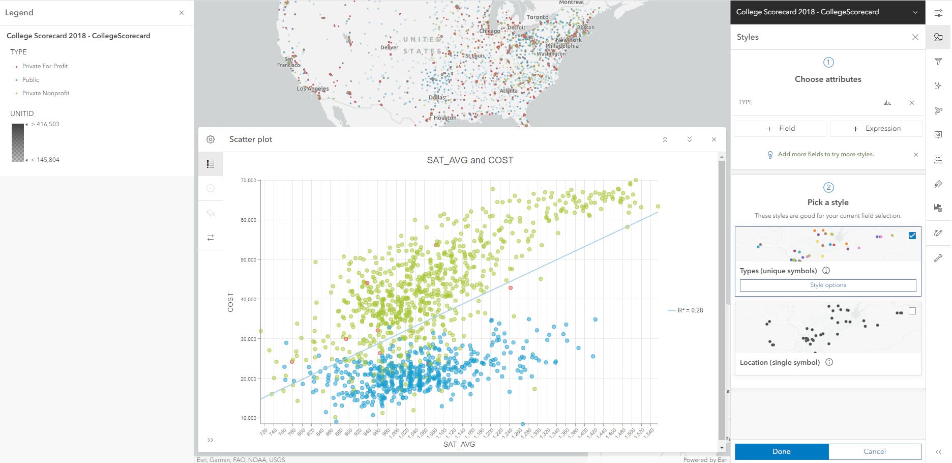 We see that the correlation coefficient (R-squared) value is low and there is a slight positive relationship but it’s not strong; however, it does look like there are two clusters in this plot. We have a variable named TYPE in our dataset, which has information about the type of college: Private For-Profit, Public and Private Nonprofit . Let us see if applying symbology will help us understand these clusters better.