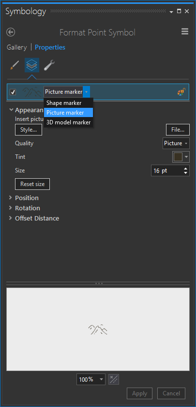 You can download these symbol images here. So, instead of the default arrows or whatever, you can click on the symbol and choose “Picture Marker.” I drew the picture symbol white (with a transparent background) because if the symbol is white, you can tint it to whatever color you want in ArcGIS Pro. Mega flexibility.