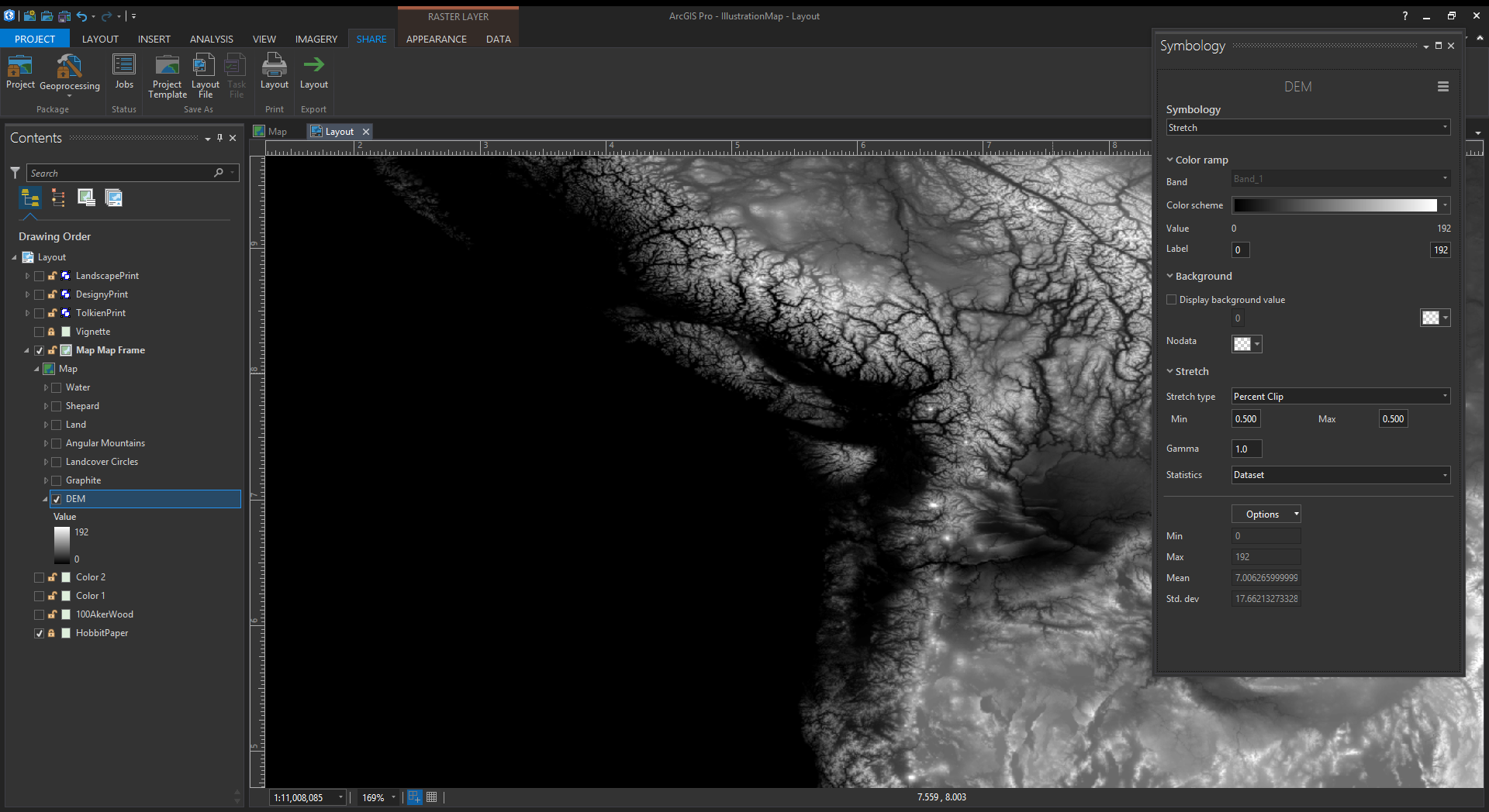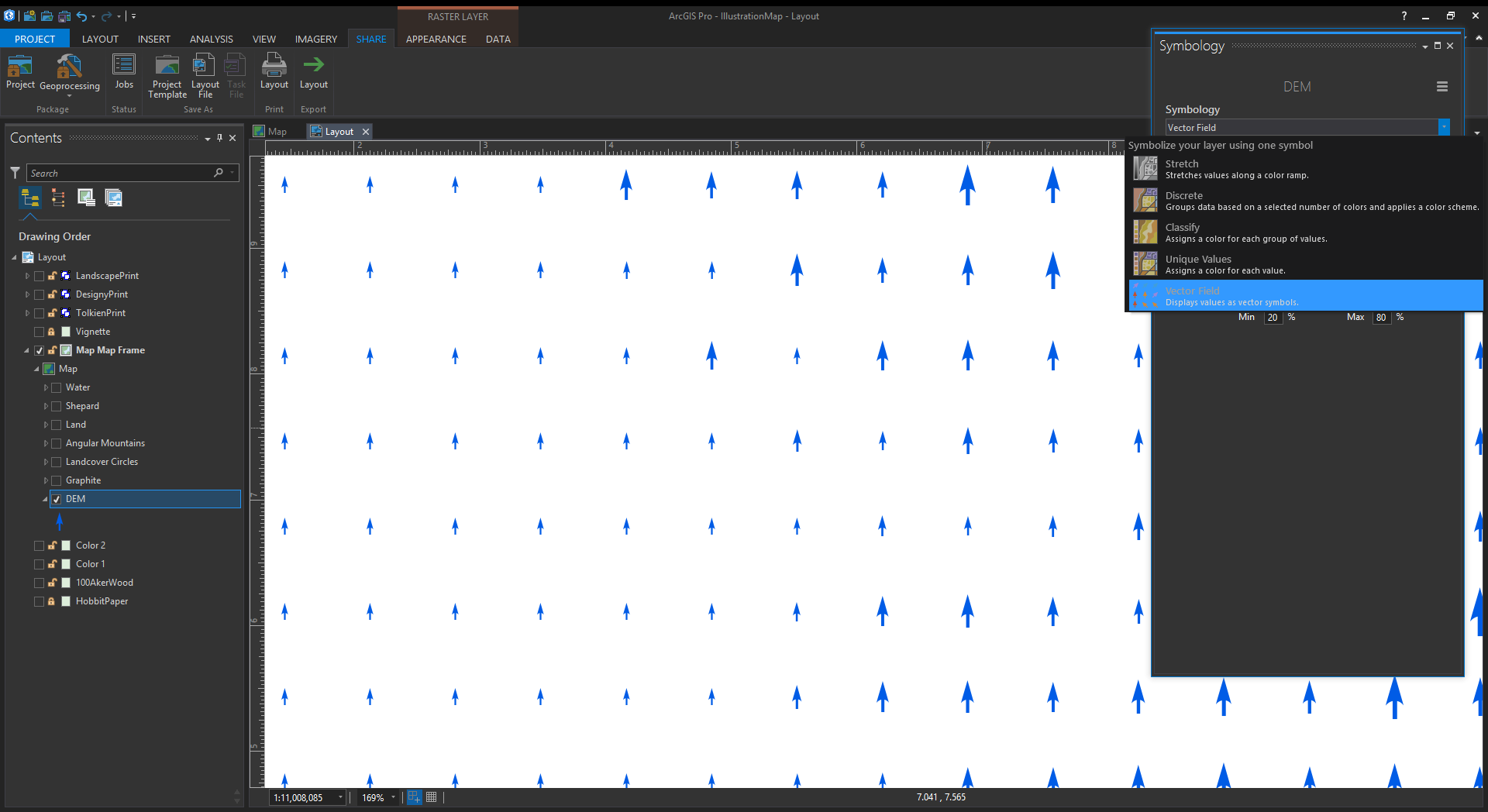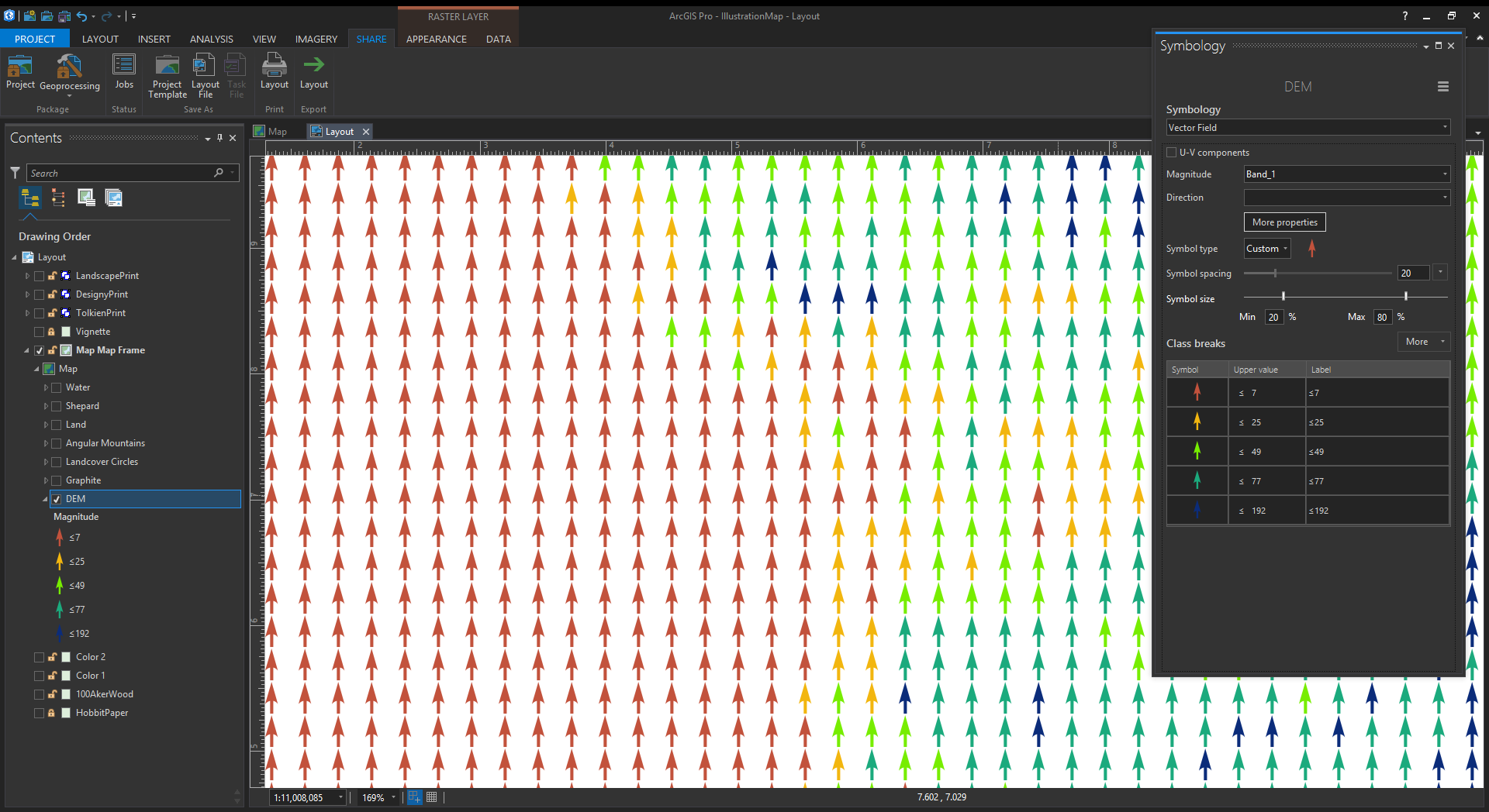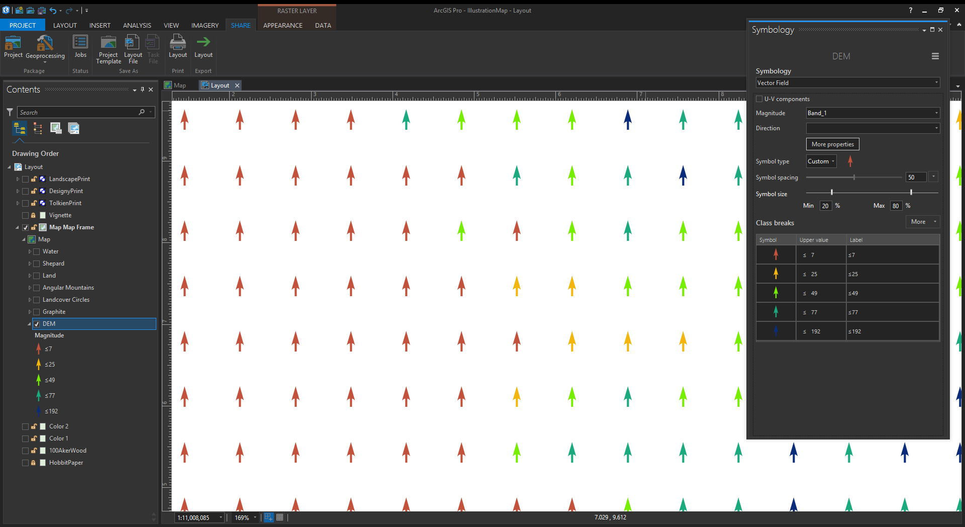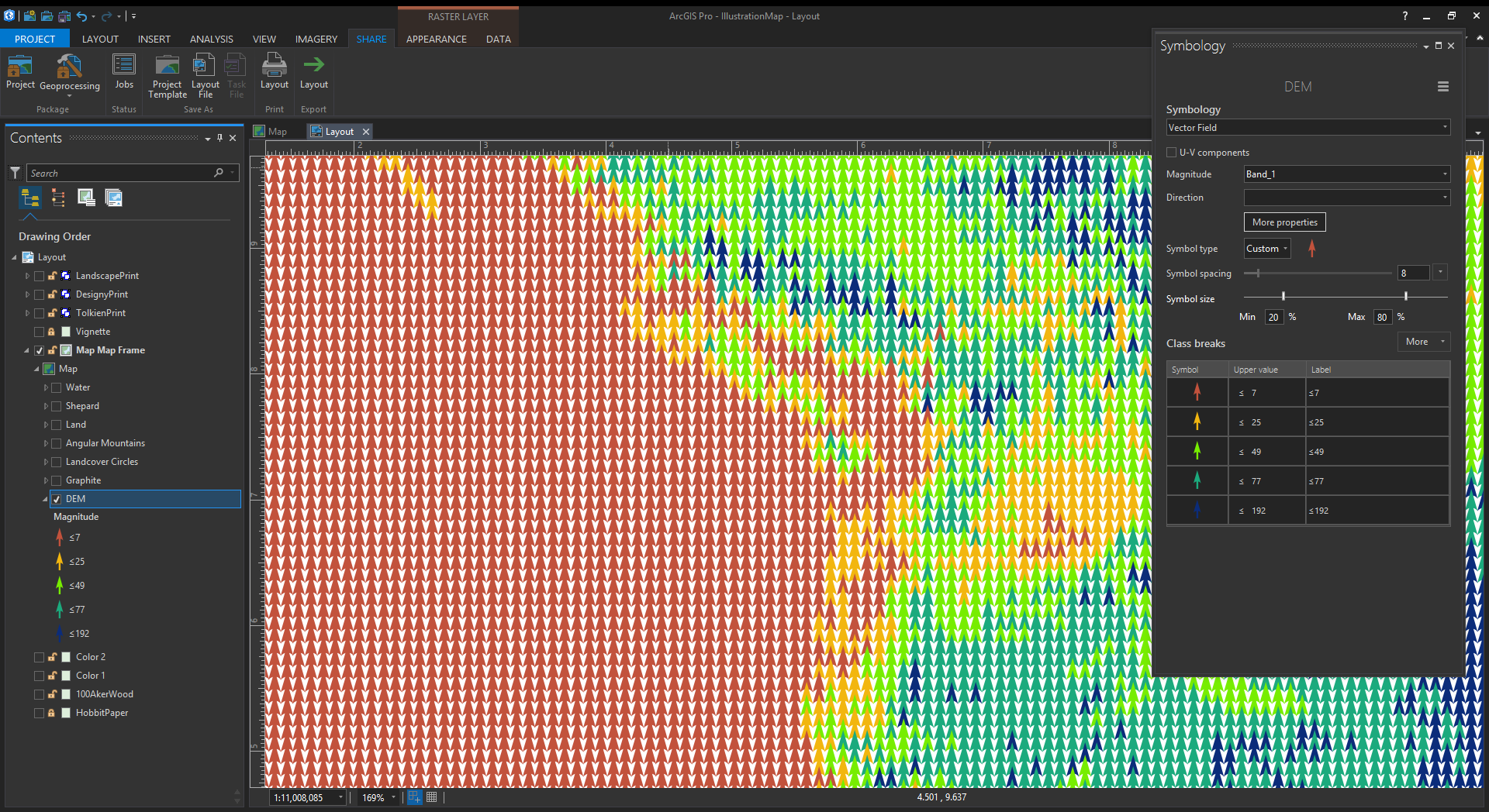 Remember, the whiteness can be keyed to a tint color in Pro. So in the symbology panel you can assign a range of colors based (and symbol sizes) on your DEM elevations. For this map, I separated the elevation ranges into a few layers so I could make their symbol spacing varied, and therefore less grid-looking. I also skipped some elevation ranges because in fantasy maps you make the rules.