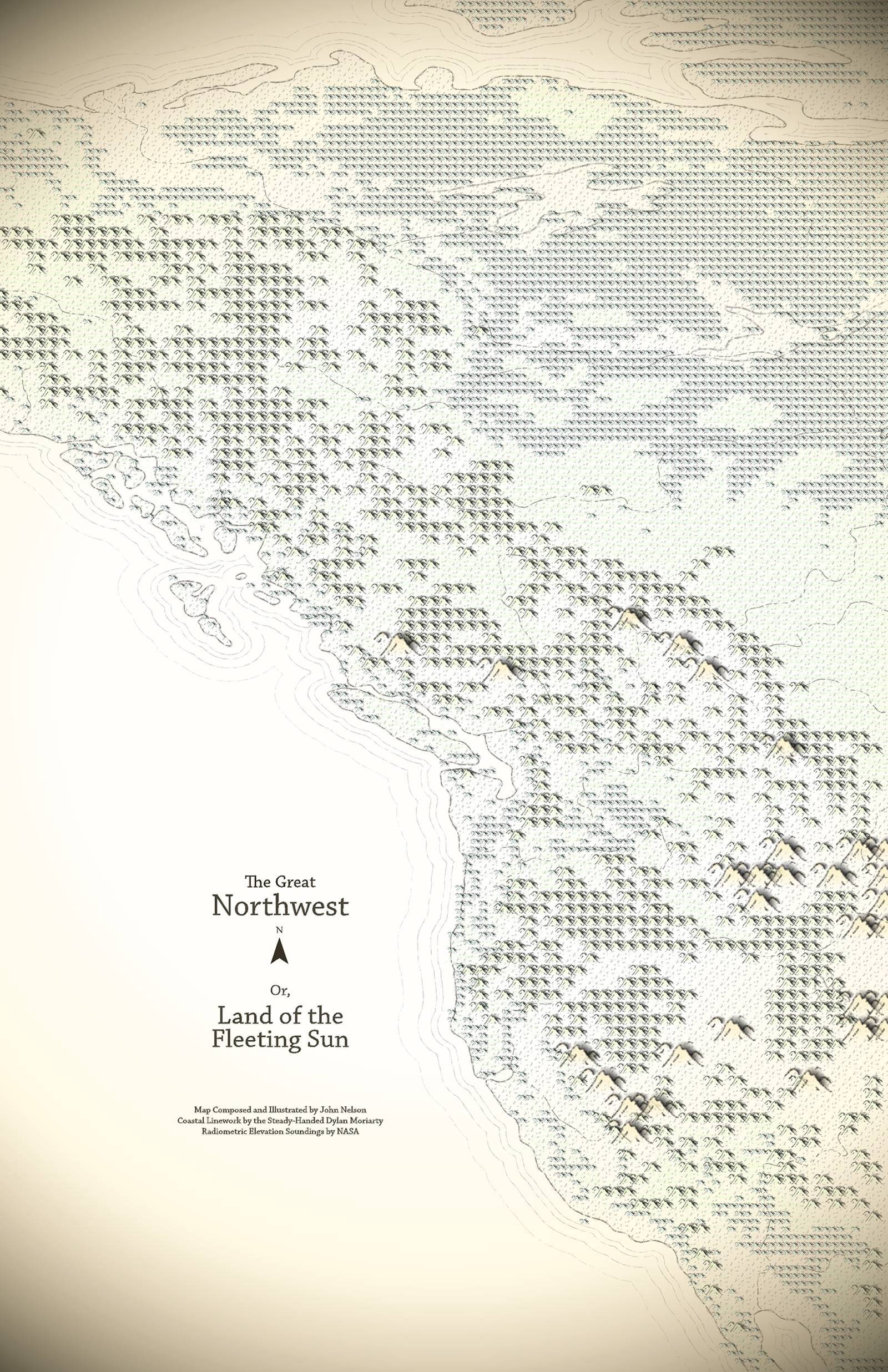 There’s no reason you have to make your mountain features look hand drawn or even fantasy-map-ish at all. You can use this hack to make any sort of elevation -derived symbol map. Here’s one with simple triangle images, tinted and sized by the vector fields’ ranges of elevation.