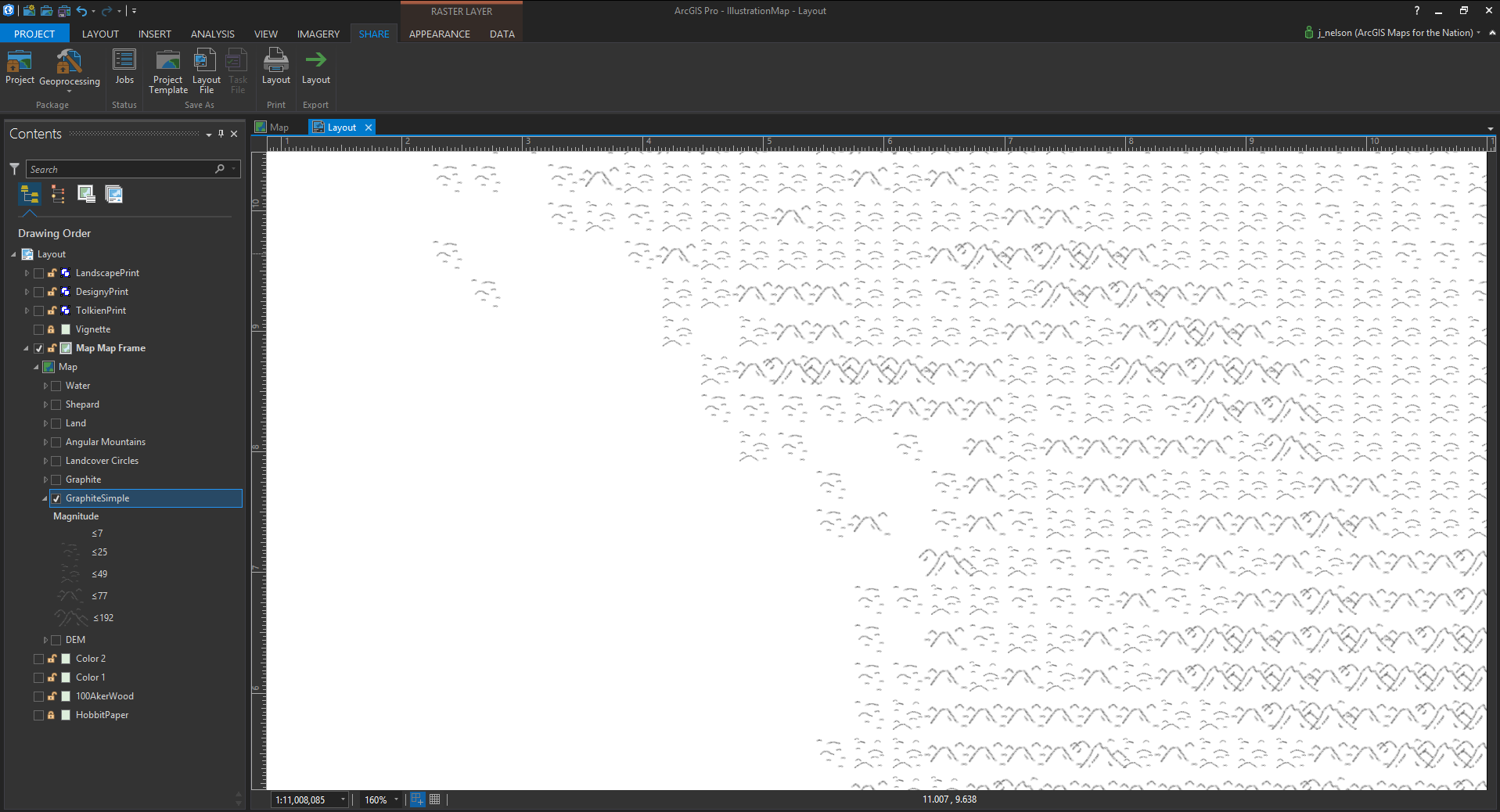 Ok, that was Part 1 for making fantasy illustration maps. We went over how to hijack the perfectly good and reasonable intentions of the “vector field” raster symbology option for our own crafty mountainification purposes. We the vector field symbology to a DEM layer to create a scale-independent mesh of landcover drawings by using picture symbols for the ranges. We learned about the visual impact of symbol spacing and sizing, and played with tint. We then got wild and tried the method out on some other images just for the sake of adventure.
