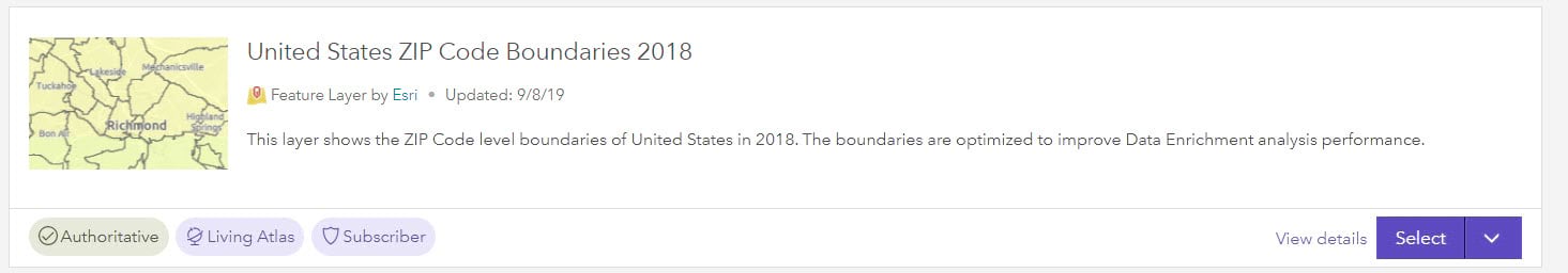 Now you can browse layers to use for the analytical tool. Click the the Living Atlas Analysis Layers tab, search for “zip code” and select the “United States ZIP Code Boundaries 2018” layer from the list of search results (Figure 5).