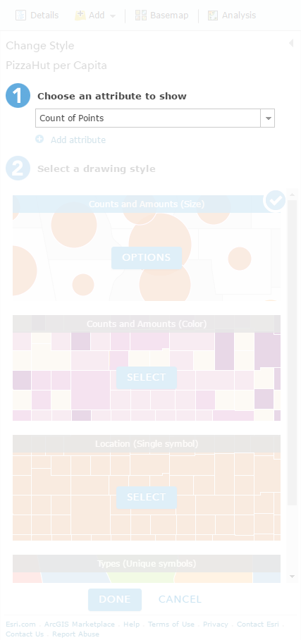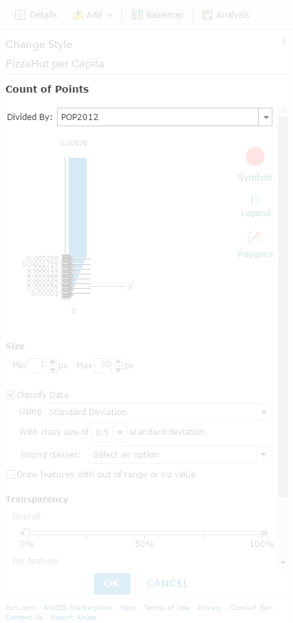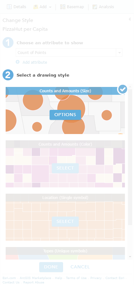 The result is a copy of the counties layer that now includes the number of pizza joints per county. Awesomely, ArcGIS Online smartly defaults the style of the resulting layer (county polygons with a count of pizza places within each) as circles placed in the middle of each county, scaled by the count of pizza locations (instead of shading the county shapes themselves). By using that thematic map style, we are pretty-much-sort-of quazi-pseudo normalizing for the underlying geographic area (a tender trap of so many election maps), putting us one step closer to normalization zen.