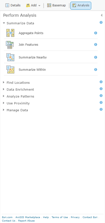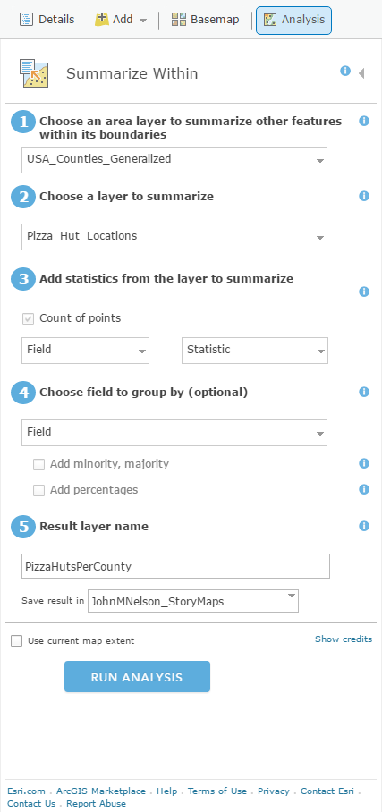 How do I get the pizza point data into a county polygon layer, just like my population data? ArcGIS Online lets you count up the features of one layer into the areas of another using “Summarize Within” in the Analysis tools. Such a handy thing. I don’t just love it. I’n in love with it.