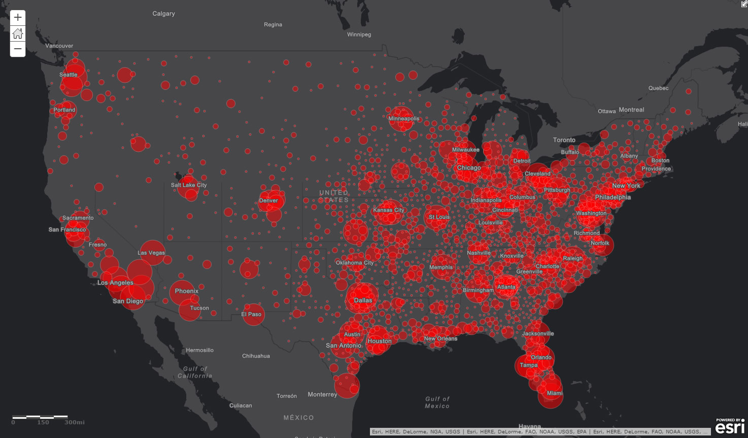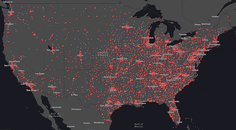 For example, here is a map in ArcGIS Online showing the locations of a popular pizza franchise in the United States (I am a big fan of their deep dish veggie lover).