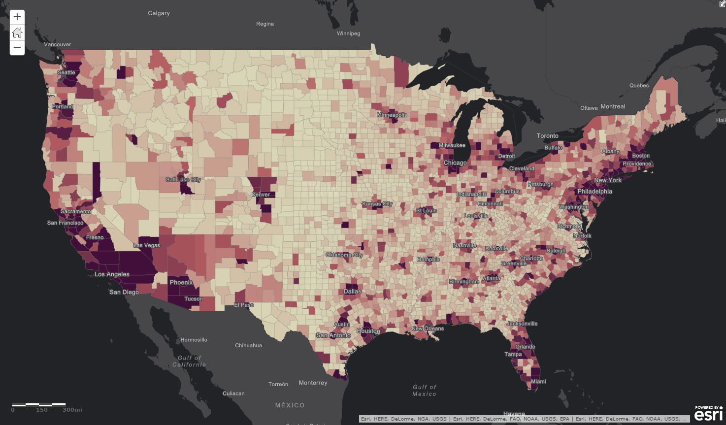 Nice, but it’s still just a de-facto population map. We still need to yank out the overwhelming influence that raw population has on the map. It needs to be normalized for the underlying population. Time for phase two.
