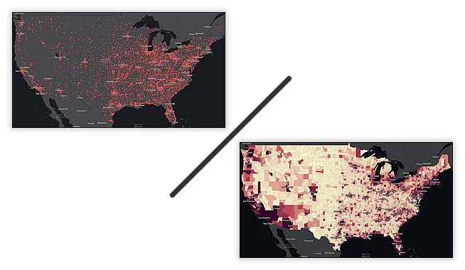 My challenge is that I’m trying to normalize the features of one layer (point locations) by the attribute of another (population of county polygons). Sounds tricky, but it’s not! Here’s how to smoosh the goodness of two layers together in ArcGIS Online.