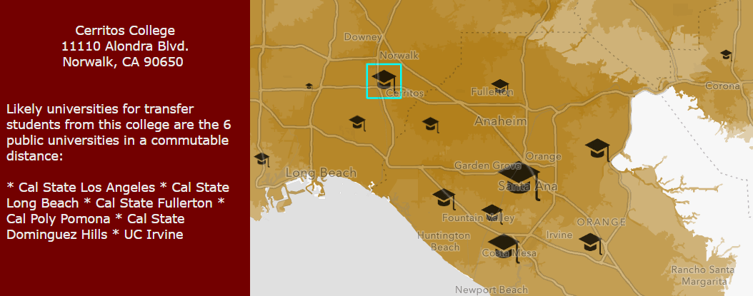 If the community college is within more than one university’s 45-minute drive-time area, which is the case for Cerritos College, we see a count and list of likely universities for transfer students: