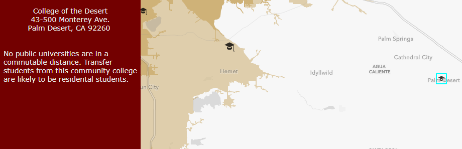 If the community college is not in any drive-time polygons from the universities, we see different text entirely: “No public universities are in a commutable distance. Transfer students from this community college are likely to be residential students.” College of the Desert is a community college in this situation: