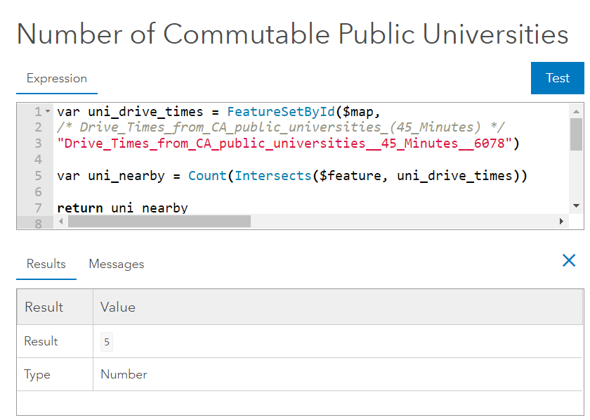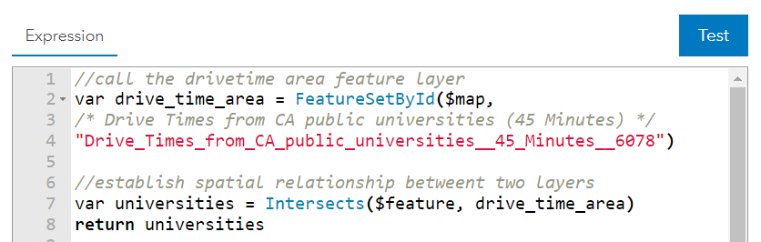 Repeat steps 1 and 2 above. This gives you a FeatureSet of the multiple university drive time polygons that the community college intersects. In order to list these out, use a for loop. For each feature in our newly-created FeatureSet, list the field called Campus. I used an asterisk and a space to separate each campus. Here’s what this looks like in Arcade: