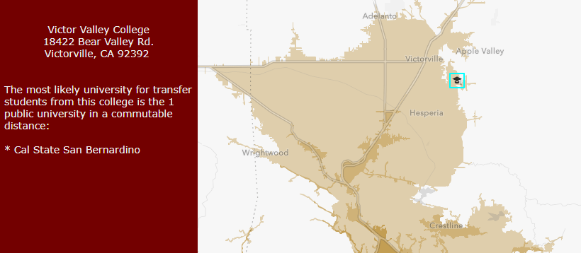 If the community college is in a commutable area for only one university, which is the case for Victor Valley College, we see a slightly different sentence: “The most likely university for transfer students is the 1 university in a commutable distance:” and then the name of that university (in this case, Cal State San Bernardino).