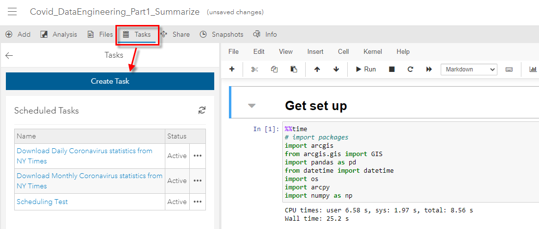 In a previous blog article, we showed you a detailed example of using ArcGIS Notebooks in “Scheduled Mode”, which is brand new functionality in the April 2021 release of ArcGIS Online. Our example was to schedule a notebook to run once a day, which downloads an online dataset from a URL, performs some data engineering on it, then produces a hosted feature layer in our organization. As part of this new built-in scheduling functionality, you also have the ability to insert parameters into the notebook, which are applied upon notebook execution. Here are some examples of use cases for scheduling parameters: