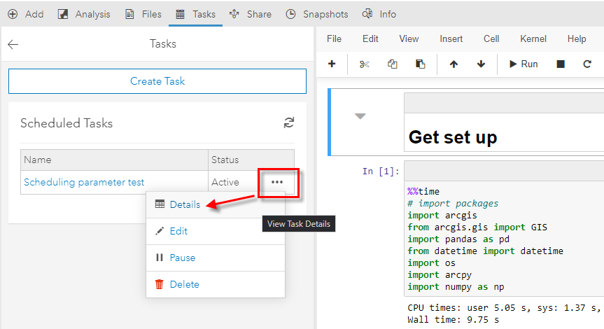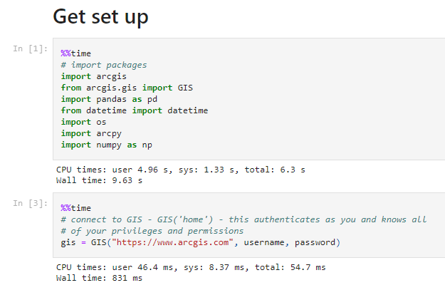 In the following example, we’ll highlight two of these use cases: First, we’ll set up some parameters to insert ArcGIS organization credentials in a notebook, then add another parameter that allows us to filter a dataset in our notebook based on a query. Inserting these parameters makes our scheduled notebooks more flexible, in that we can change the code and results without actually changing the code. When using notebooks in scheduled mode, the parameters are the only place where there is any user interaction with the notebook.