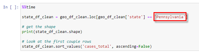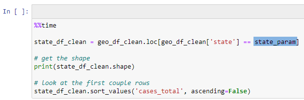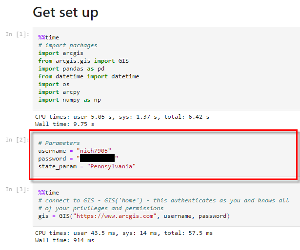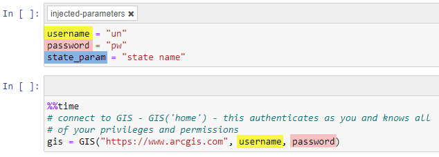 Step 1: Decide which notebook values you want to be able to change using parameters. In my case, I want to use parameters to hide the username and password to log into my GIS, as well as a parameter to filter my US county-level dataset to a particular state.