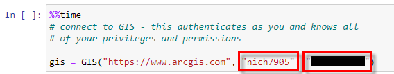- You have administrative workflows that require password/access key protection, so you create parameters for these credentials. For example, you have an Amazon S3 Bucket data source that you want to pass into your notebook at execution time, but you do not want the AWS Access Key to save when you share the notebook. Another example would be that your notebook has a code cell for an ArcGIS organization username and password, which you do not want visible when you look at the HTML preview of the completed scheduled notebooks.