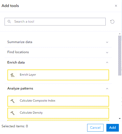 Following feedback from our beta testers, ModelBuilder’s “Add tools” interface now organizes tools into the same categories as in ArcGIS Online feature analysis tools, making it easier to locate and implement the tools you need.