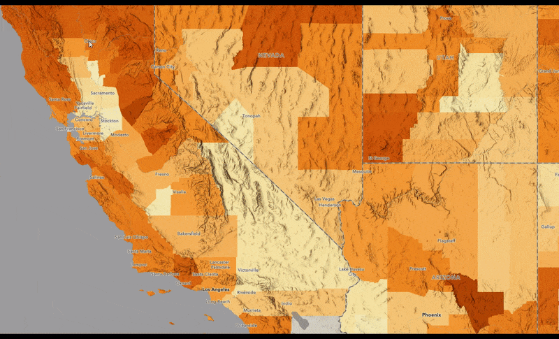Next, the layers were enriched with 2020 Esri demographic attributes in order to better visualize wildfire hazard risk as it relates to the human population. Attributes include population, households & housing units, growth rate, and calculated variables such as population change over time. Additionally, state, congressional district, and county have a population weighted average WHP score created from the hex value population values which help us better understand the human impact for larger geographic areas. For full detailed steps, please visit the layer’s item detail page.