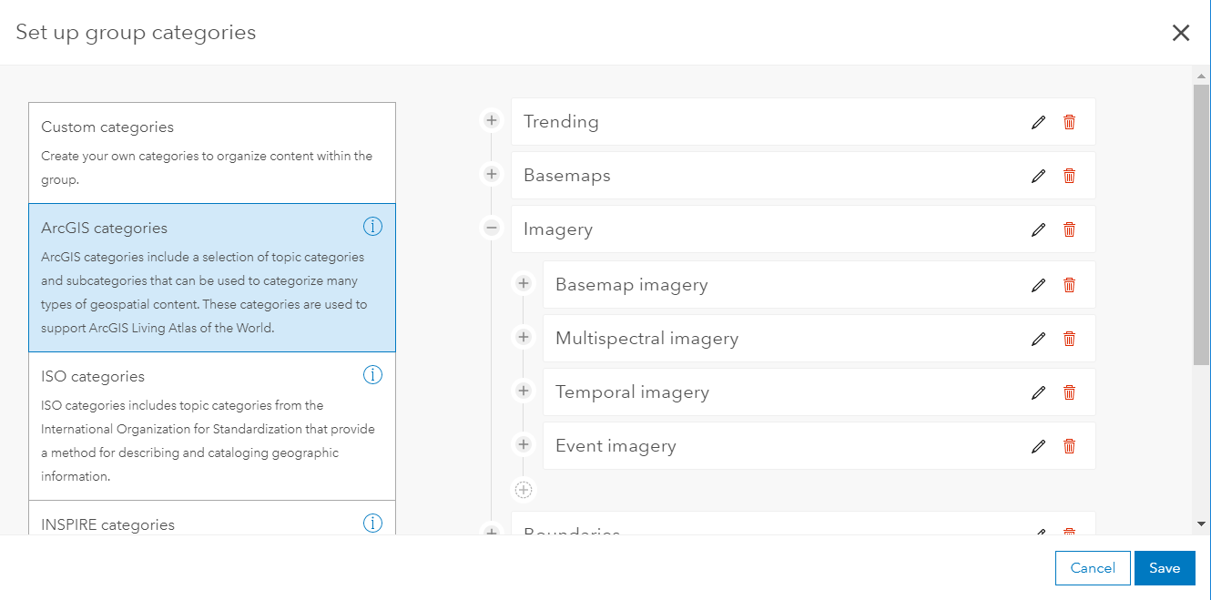 Content categories are introduced, a new way to organize content across your organization. You can establish hierarchical categories for your organization or group content by choosing from standard category templates, such as ArcGIS, ISO, or INSPIRE, or by creating custom categories that make sense within your organization, or support projects and workflows.