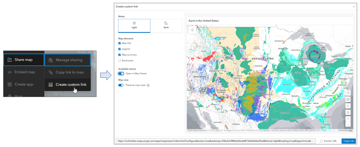 Create custom link, introduced in the October update, enables you to configure a simple viewing experience by choosing from a variety of options, such as including a legend, summary, bookmarks, preserving map scale, or using light or dark modes. This delivers an alternative to using app builders, providing a quick and easy way to share any map in a customized way. For more information, see Customize a simple view of your map.