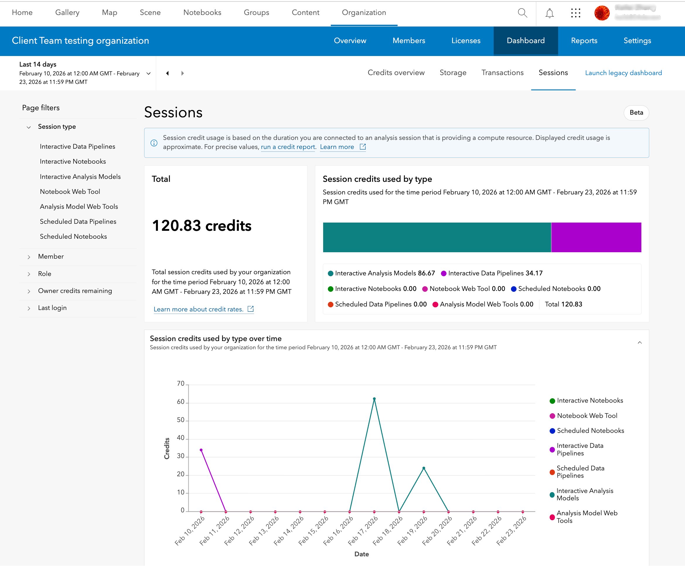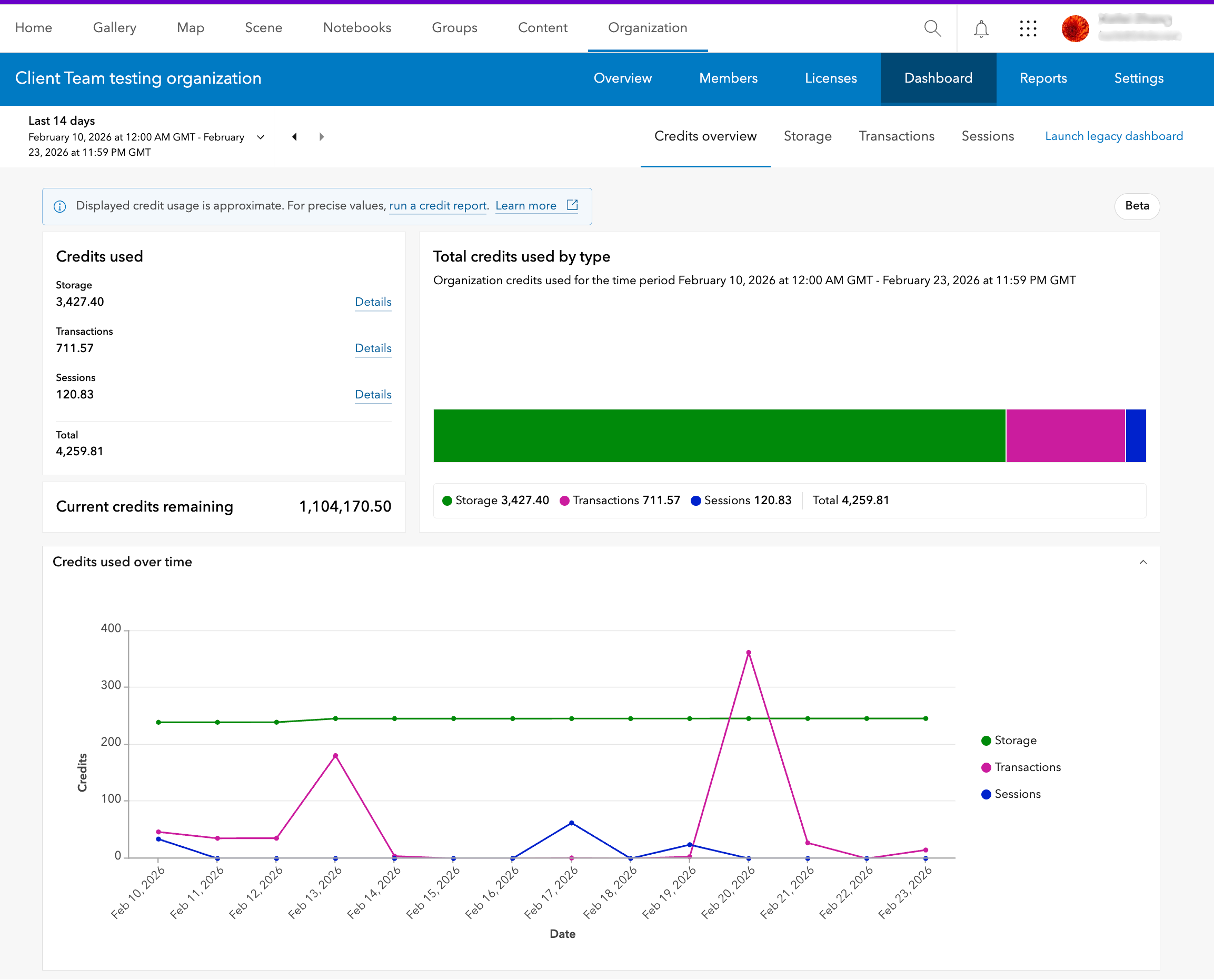 The new beta dashboard provides insights about credit consumption of the organization. The dashboard organizes credit consumption into three primary categories – Storage, Transactions, and Sessions, that are based on how credits are consumed by the organization.
