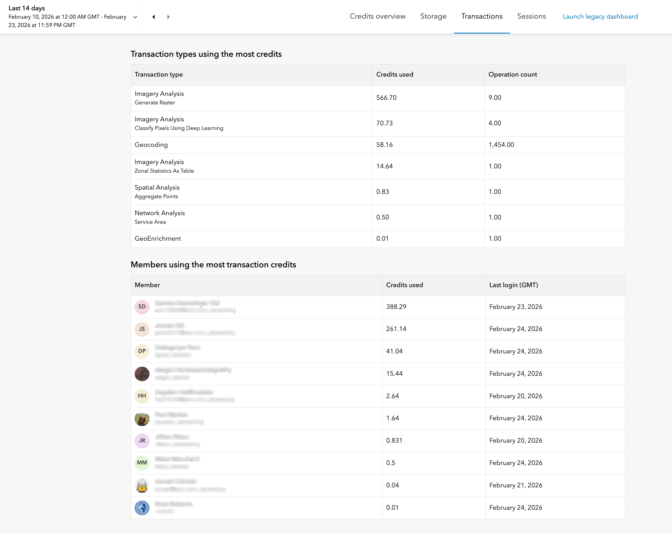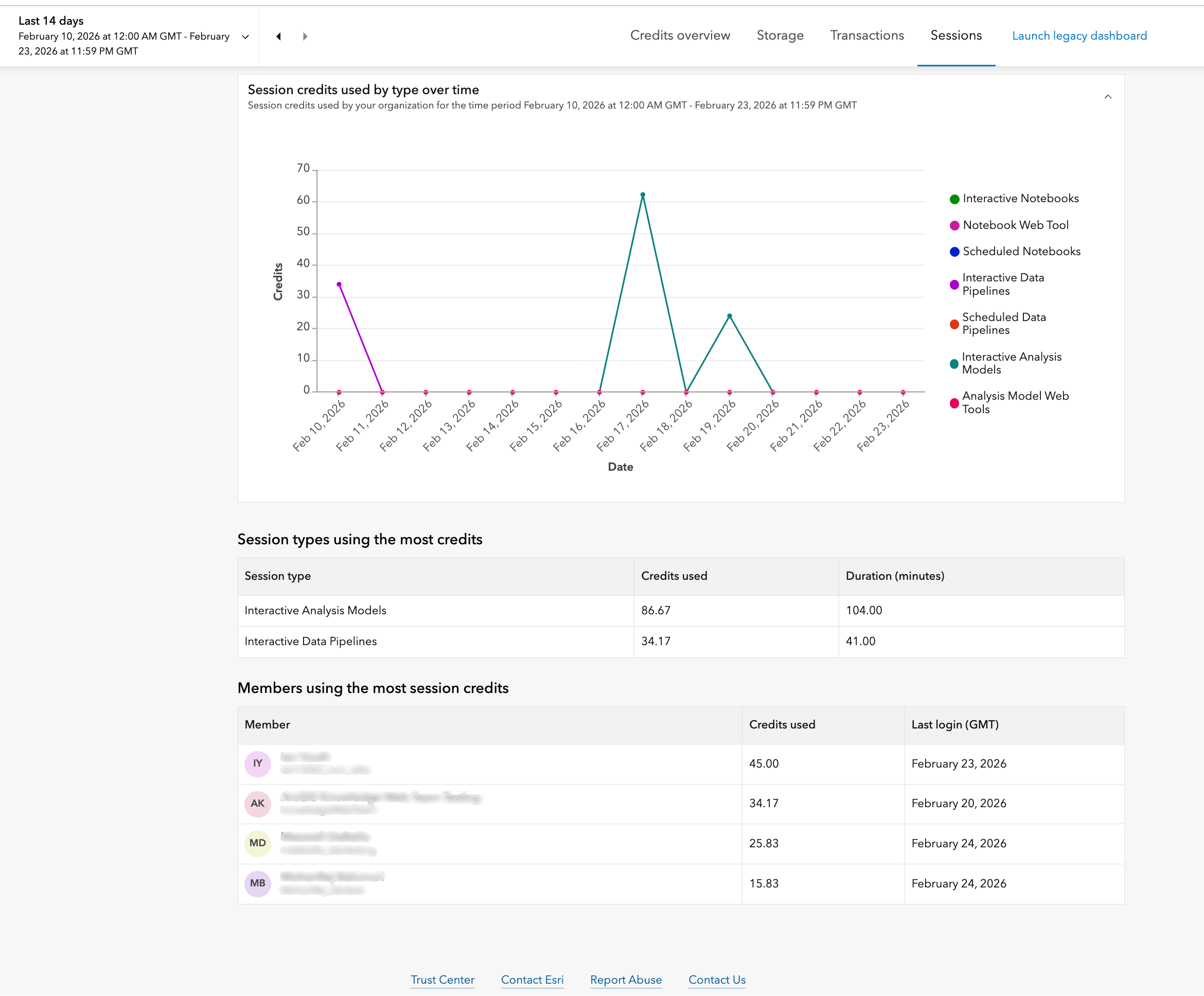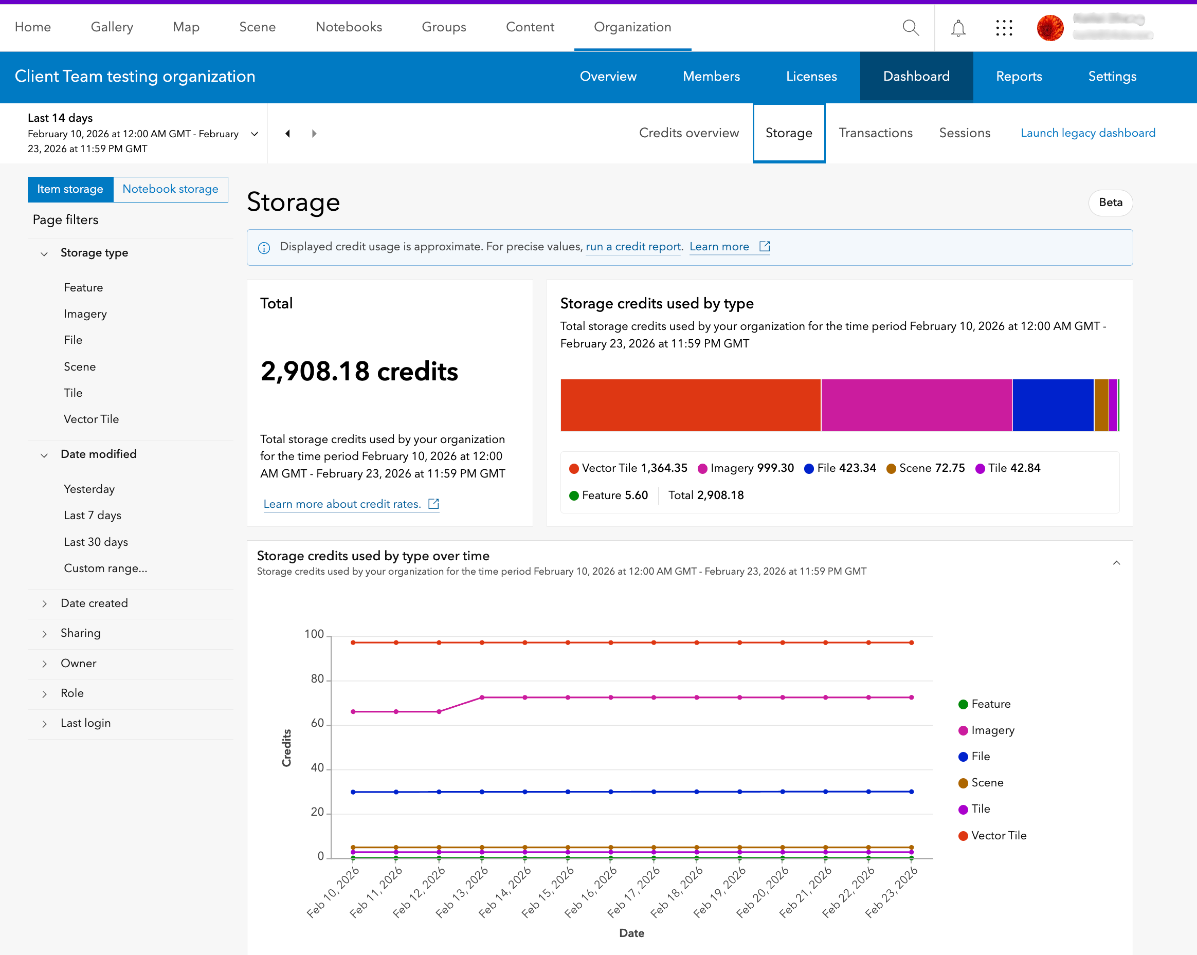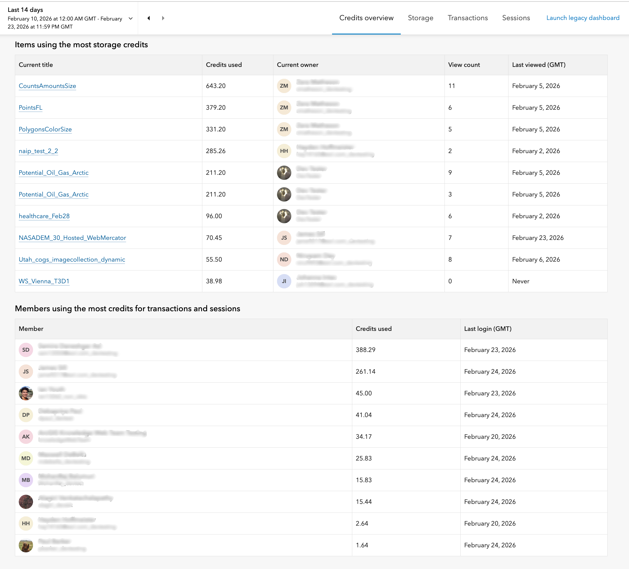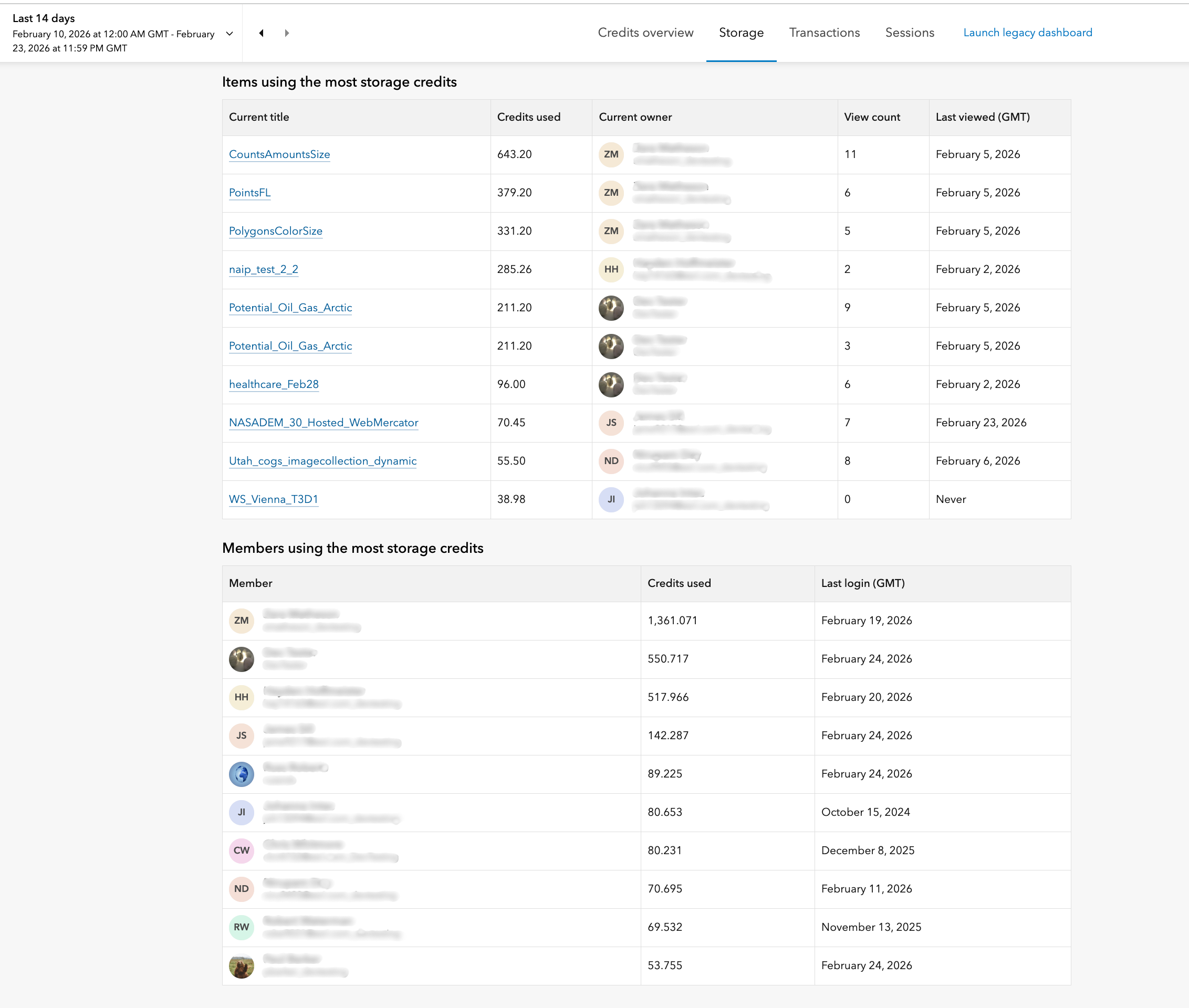“Storage” refers to the storage of items in your ArcGIS Online organization. For more information about storage, check out Credits and storage. Storage is organized into two subcategories – item storage (such as hosted feature layers) and notebook storage (for notebook-specific files and outputs), making it easier to monitor and optimize usage for different workflows. You can see up to 100 members whose items collectively consumed the most credits for storage in the selected time period, and up to the top 100 individual items that consumed the most credits as well.