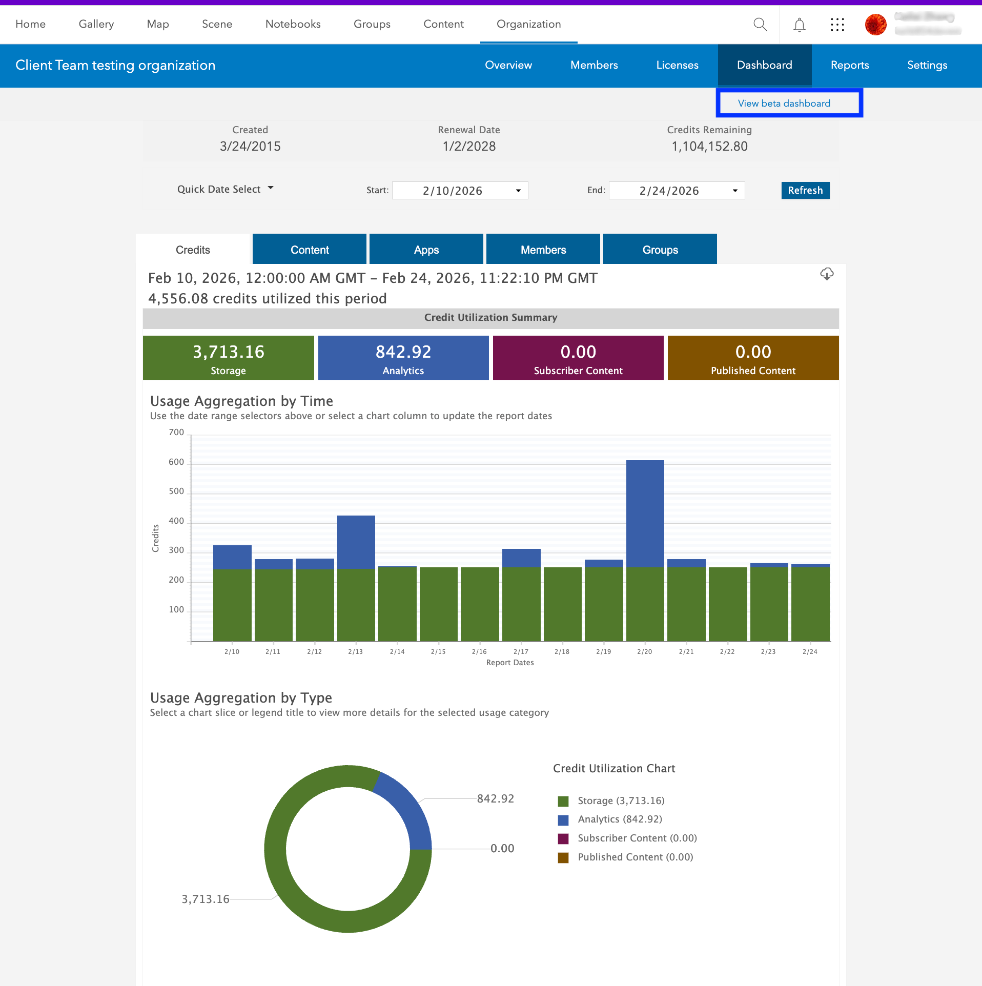 - To view the beta dashboard, your organization should have beta apps and capabilities unblocked. You can access this setting at Organization Settings > Security > Blocked Esri apps and capabilities
