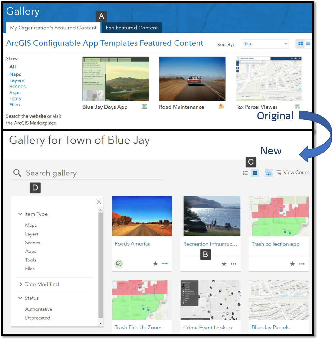 When you first see the new design of the gallery page, you will notice some layout changes. The Gallery is no longer a tabbed experience featuring both organization content and Esri content (A). The focus of this page is focused solely on the organizations featured content. (Don’t worry, Esri content can now be found on the content tab under the living atlas or when using search).