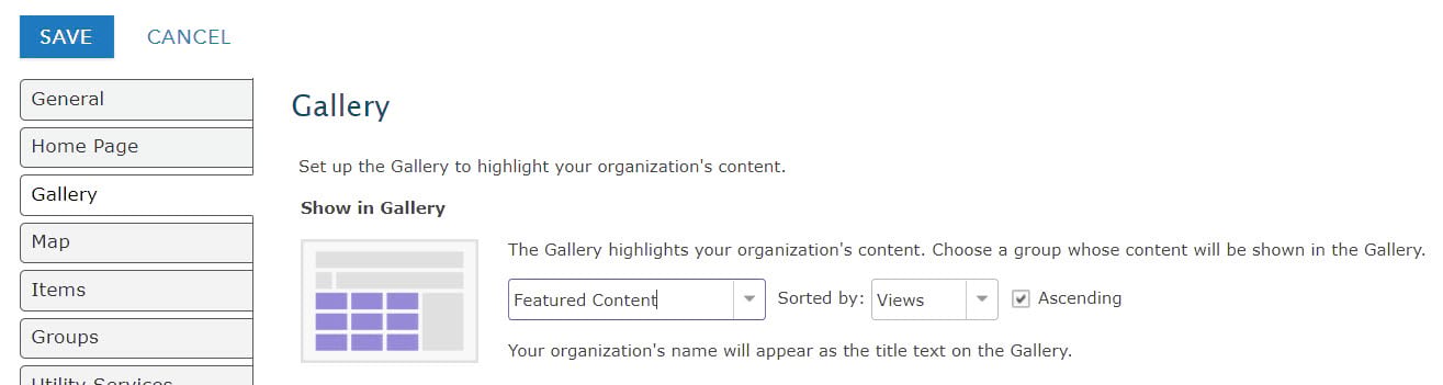 The gallery can be configured to meet many organizational needs. The gallery can be used in an organization as a location of highlighted datasets that all members need to browse and access regularly, or a mechanism of highlighting newly created information products. In this case, the intended visitors would be organization members, who would sign into the organization to view the gallery. The gallery could be used as a landing page for the public, highlighting key applications or layers that public visitors could interact with. Identifying the purpose and visitors will guide the method and settings in the next steps.