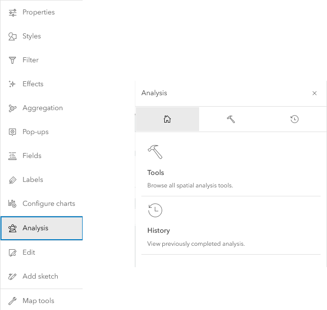 In Map Viewer, there is a new way to access analysis. To start, select “Analysis” from the Settings (light) toolbar, which opens the analysis pane. The analysis pane has two options: tools and history.