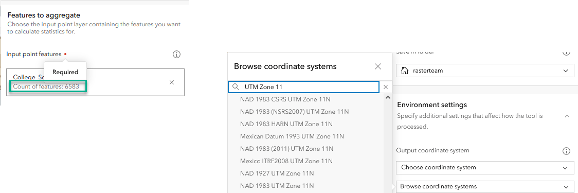 We added more details about the tools in Map Viewer to make them easier to use. For example, required parameters are marked with a red dot. Once a layer is added, you can see how many features will be analyzed. With the new Environment Settings, you can now specify a projection for the analysis output layer, it does not have to be the same projection as the input layer.