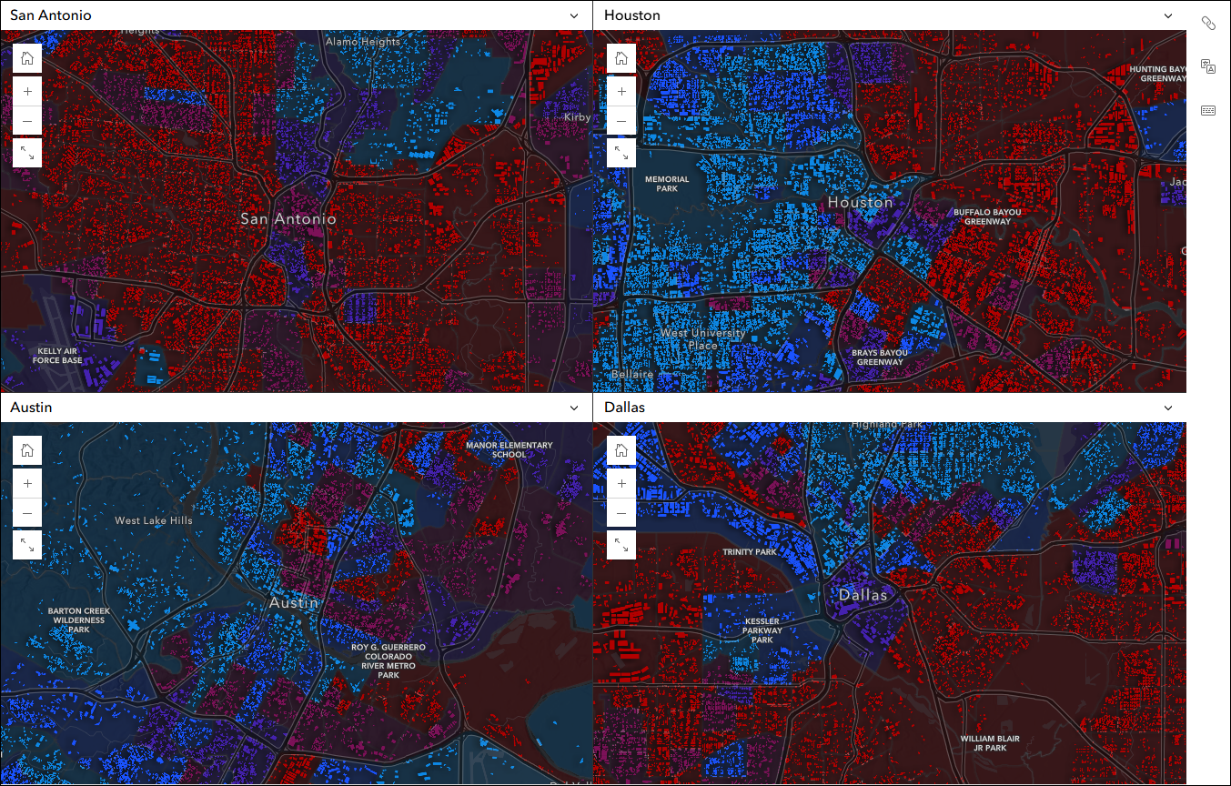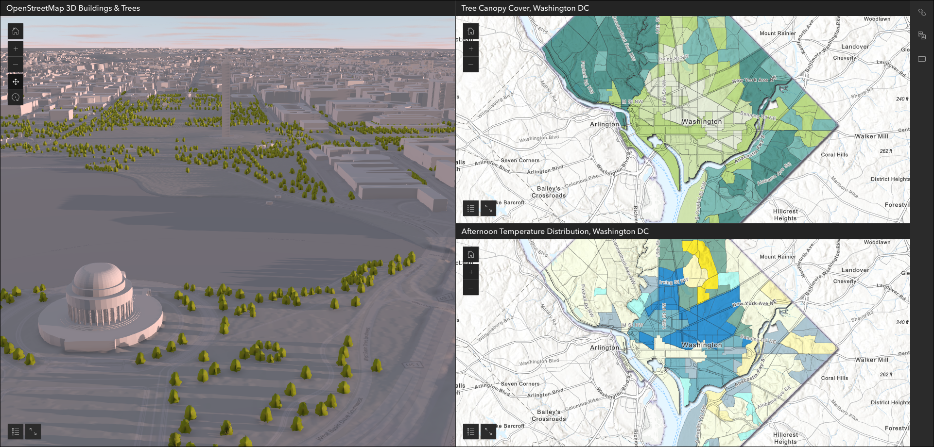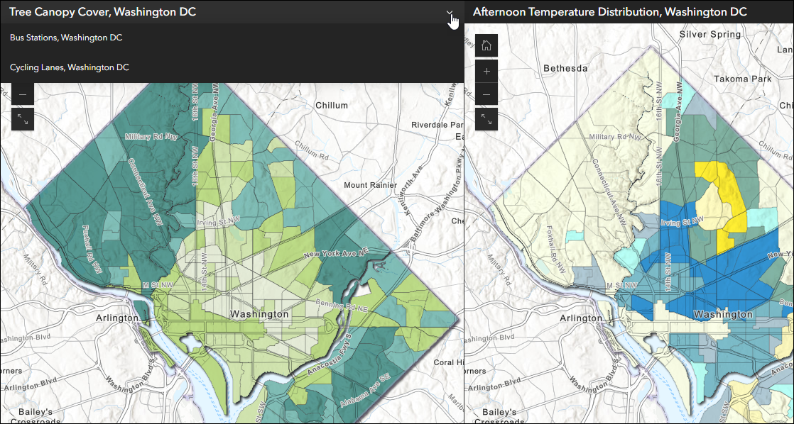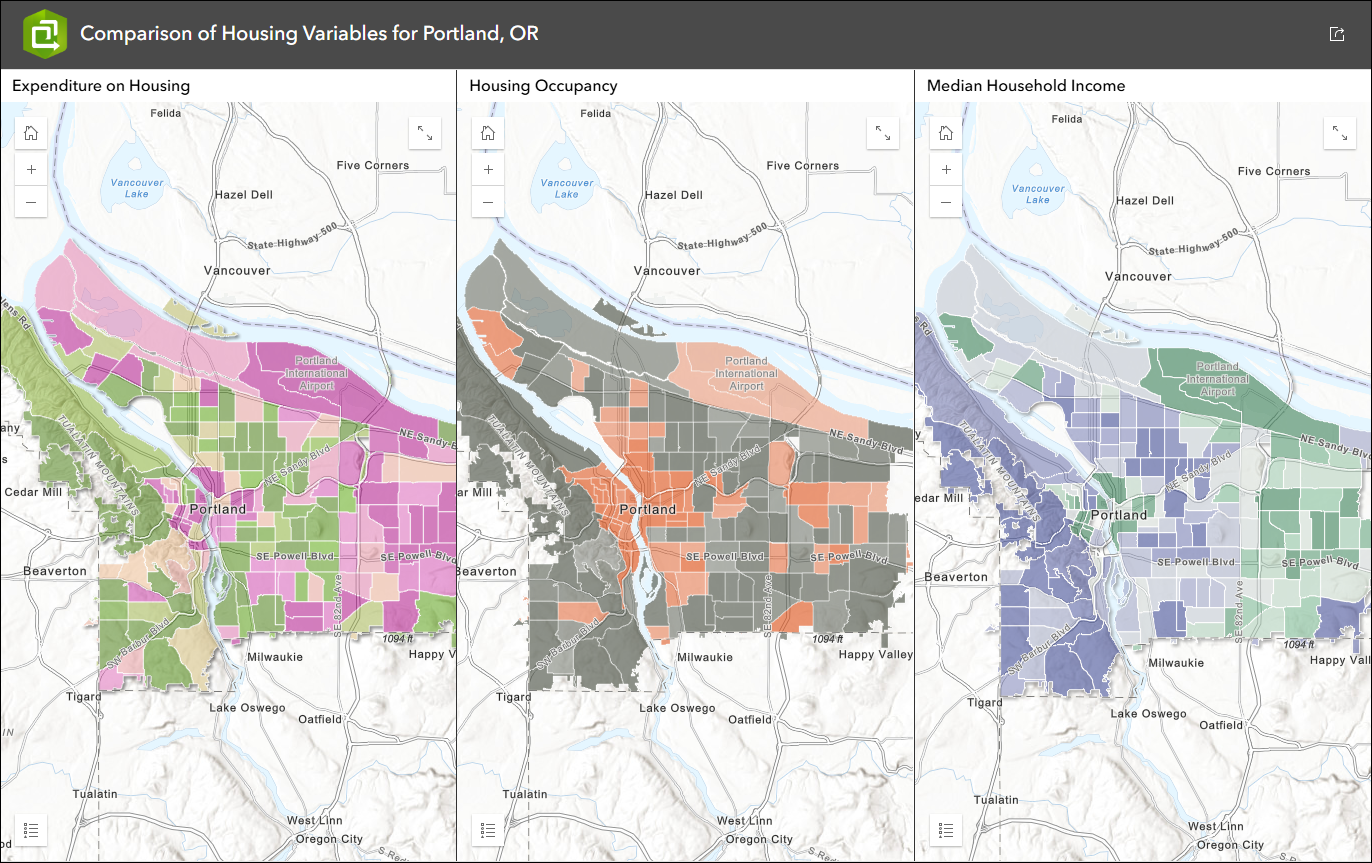 Use Multiple maps mode to compare different data at the same location such as housing cost, homeownership, and median income. Use the app configuration to choose each map containing the different data variables. By default, each map will load to the exact same location based on the map you choose for Map 1 in the configuration. Remember, both maps and scenes are supported so feel free to include 2D and 3D in your comparison.
