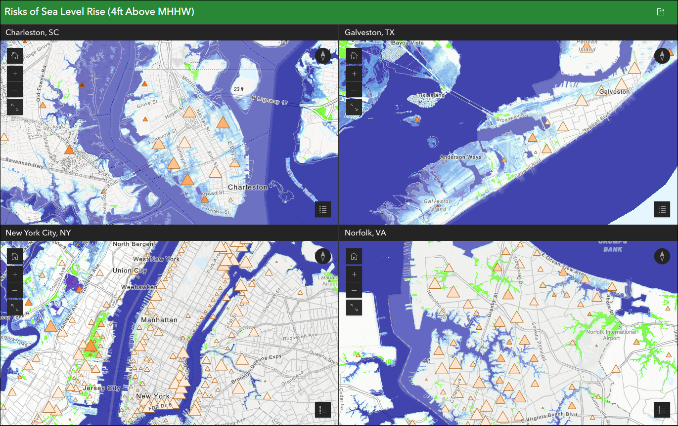 Use Single map mode to compare data at multiple locations such as the impact of sea level rise for different US cities. In this mode, one map or scene contains all of your data, and you use the app configuration to choose which locations you want to compare. This lets you view multiple, non-contiguous locations of your map at the same time in the same app layout. After choosing your map or scene, you can either create locations manually or import bookmarks/slides to instantly generate locations to compare. In many cases, this mode will save you the big step of creating multiple web maps that all contain the same data.