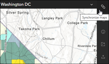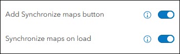 - Add Synchronize maps button and Synchronize maps on load – Map synchronization is pivotal when using an app that is purposed for comparison. This template includes a couple settings that can be configured to offer the synchronization experience that you prefer for your audience. Enable the “Add Synchronize maps button” setting in the configuration to add a sync button to the app. The app viewer can use this button to enable universally synchronized map navigation across all maps or locations in the app. Enable the “Synchronize maps on load” setting in the configuration if you want the app to load with all maps or locations automatically synced. For simplicity reasons, this setting uses the extent of the map chosen as “Map 1” (or the first location in Single map mode) in the configuration.