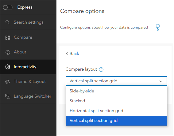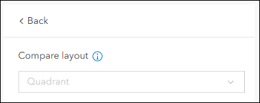 - Compare layout – Customize your app by choosing a preferred layout. Use the “Compare layout” setting on the Interactivity > Compare options tab of the configuration to choose from a drop-down of choices. The layout choices will vary depending on the number of visible maps or locations you have set. For example, if you have chosen 4 visible maps then the only layout choice is “Quadrant”. Apps that are configured to show 2 or 3 visible maps will offer more layout choices such as Side-by-side, Stacked, Horizontal split section grid, and Vertical split section grid.