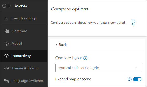 - Expand map or scene – Include a button in each map or scene to view it in more detail. The “Expand map or scene” option is useful when comparing data and you want to get a more detailed view while exploring. Click the button in the app to have the map do a full take-over of the app layout. To collapse the map, click the same button to return to the regular app layout. This setting is found on the Interactivity > Compare options tab of the configuration.