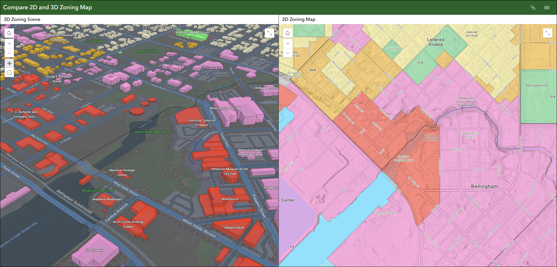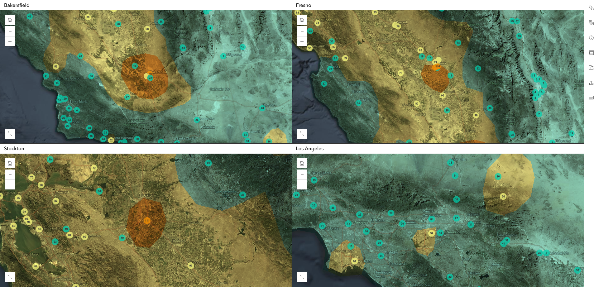 Visualize data at one or more locations using multiple maps and scenes with side-by-side or stacked layouts with the brand new Compare template. Choose between two comparison modes to compare multiple maps at the same location or compare multiple locations of the same map. These modes will be described below. This template supports up to 4 maps, scenes, or a combination of both at once. Import bookmarks or slides, or create locations manually to compare areas of the same map or scene. The views can be synced when using the app.