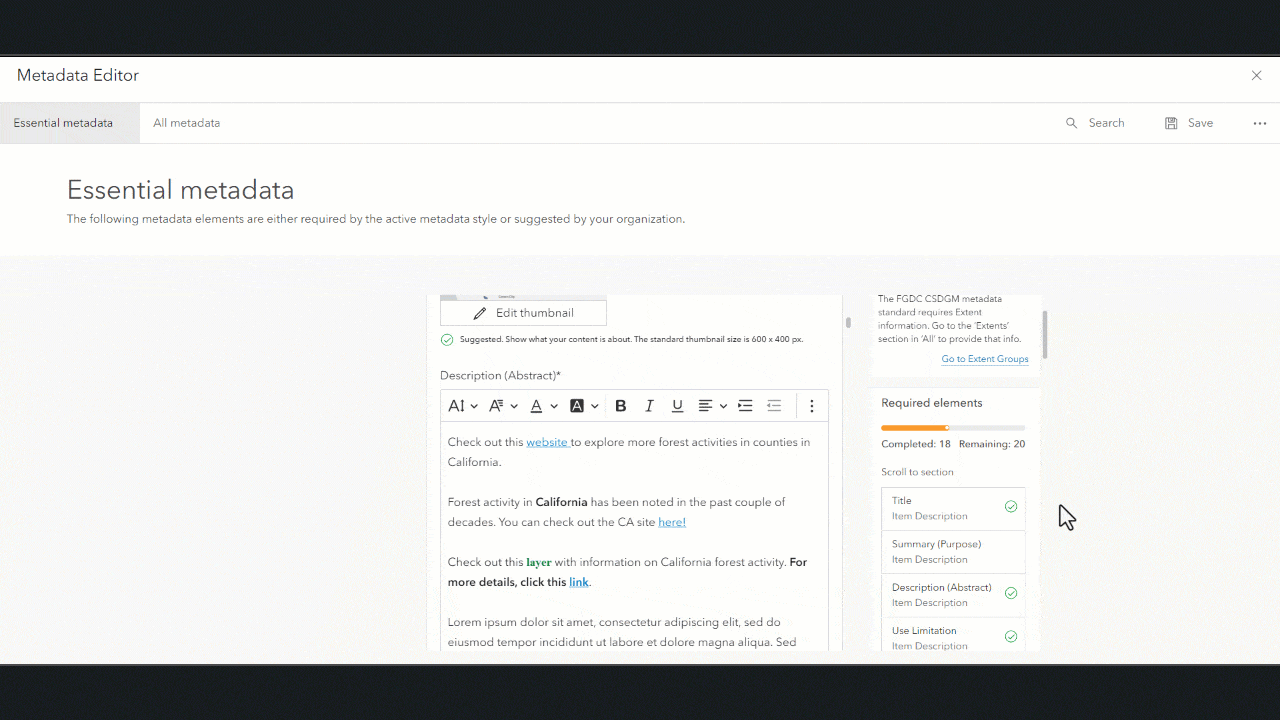 The long-term goal is to reduce the complexity, enhance, and unify the metadata editing experience across the ArcGIS platform. As you explore the new editor, look out for future enhancements in the road ahead. Share your feedback on the Metadata, Catalogs and Search Esri Community.