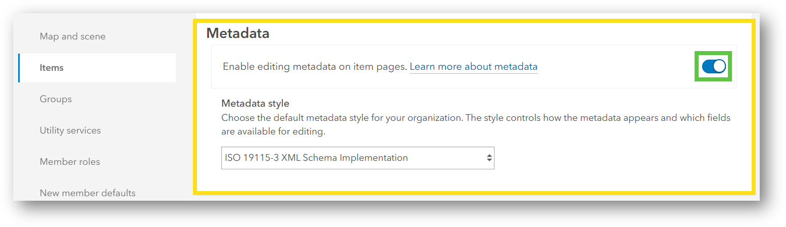 Administrators can enable and configure metadata settings for their organization, allowing item owners to edit metadata for their items based on the metadata style configured. Once metadata editing is enabled, item owners and administrators will have access to the new metadata editor from the item’s page.