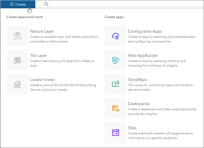 Improvements to the Create menu make it easier to create different types of content directly from the content page. New options include story maps and sites.
