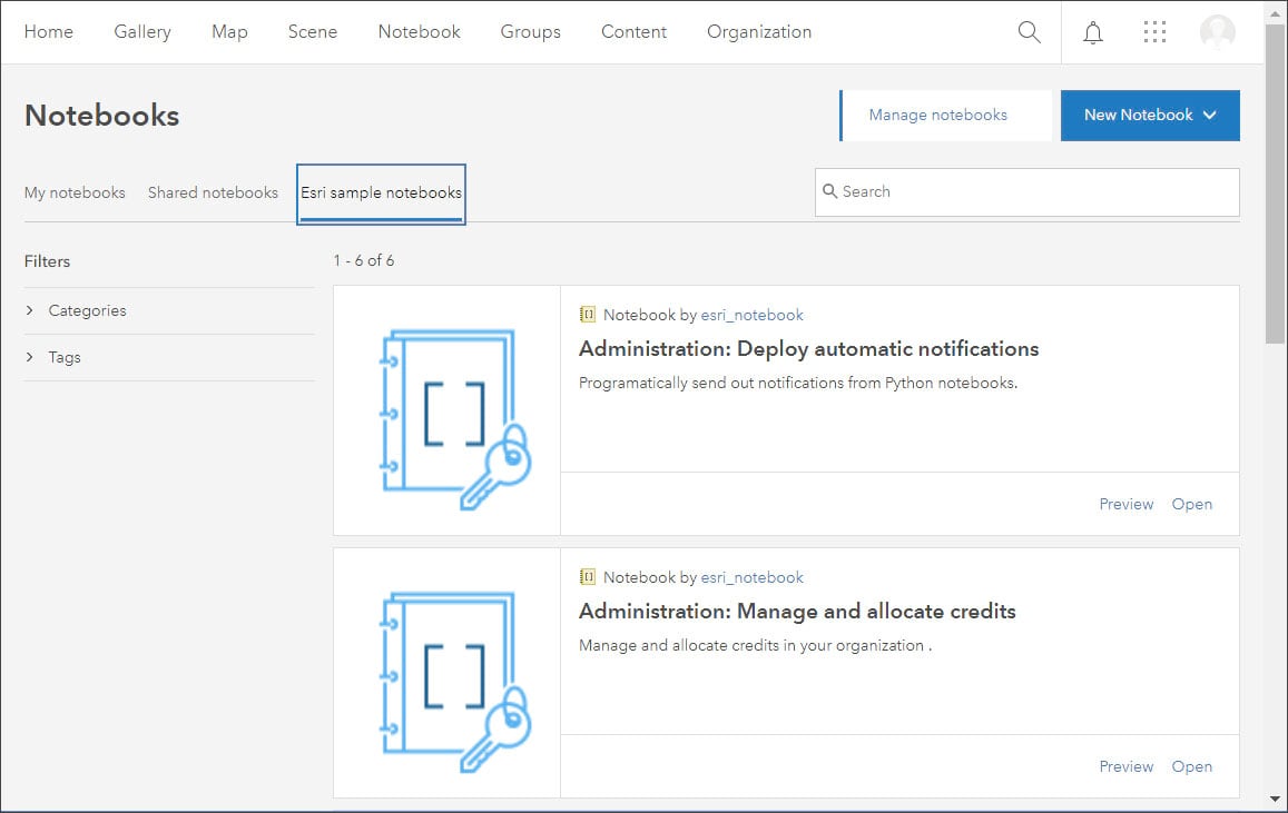 ArcGIS Notebooks now has a new and improved home page experience, letting you have a comprehensive view of all of the notebooks you’ve created, notebooks shared with you within your organization, and curated notebook samples that are available for you to quickly start your own automation and analysis workflows. A new notebook search feature lets you quickly find the notebooks that you are looking for by entering the notebook name.