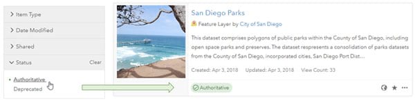 New with this release, these features are now available outside your organization. Organizations can have their identities verified by Esri, which enables them to share authoritative content publicly using the Authoritative badge. Public content that is designated as authoritative can be easily identified by the badge, is boosted in search results, and can be found easily using the Status filter.