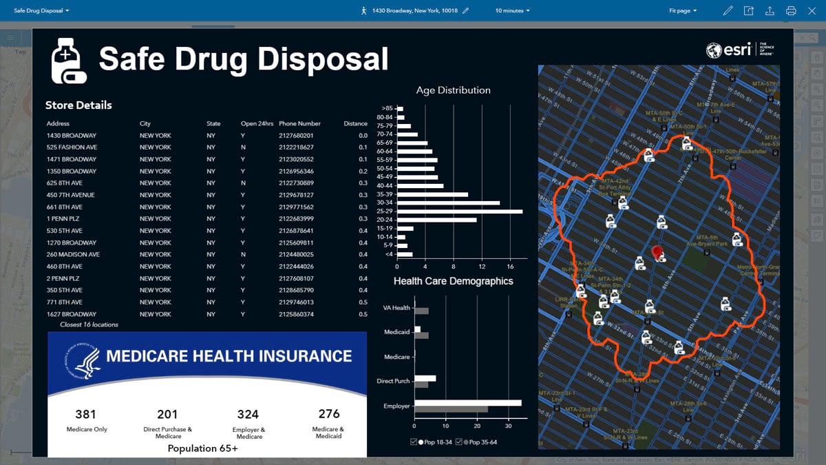 The latest update of Business Analyst Web allows you to access 2018–2023 U.S. demographics; summarize nearby locations, such as restaurants that are within a specified distance from a proposed new sandwich shop; and use filtering to show locations that meet your criteria. For example, you can filter a crime layer based on crime type and time to understand patterns of where instances of arson occurred. In addition, you can compare sites with administrative geographies in a single click to see how key demographic facts for a site compare to the geographies where the site is located. Finally, use the new Tapestry Profile template to view infographics in a tapestry poster style. For more information, see What’s new in Business Analyst or the Business Analyst Web App product documentation.